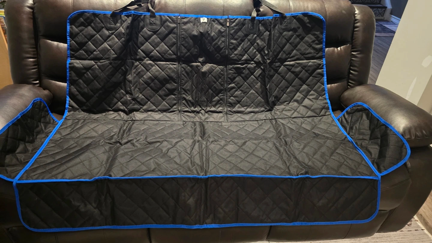 This cover is designed to protect vehicle upholstery from dirt, hair, and scratches caused by pets.