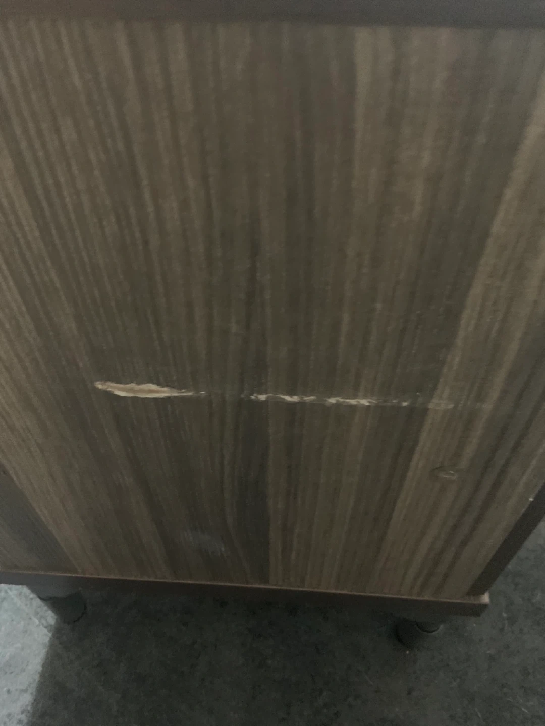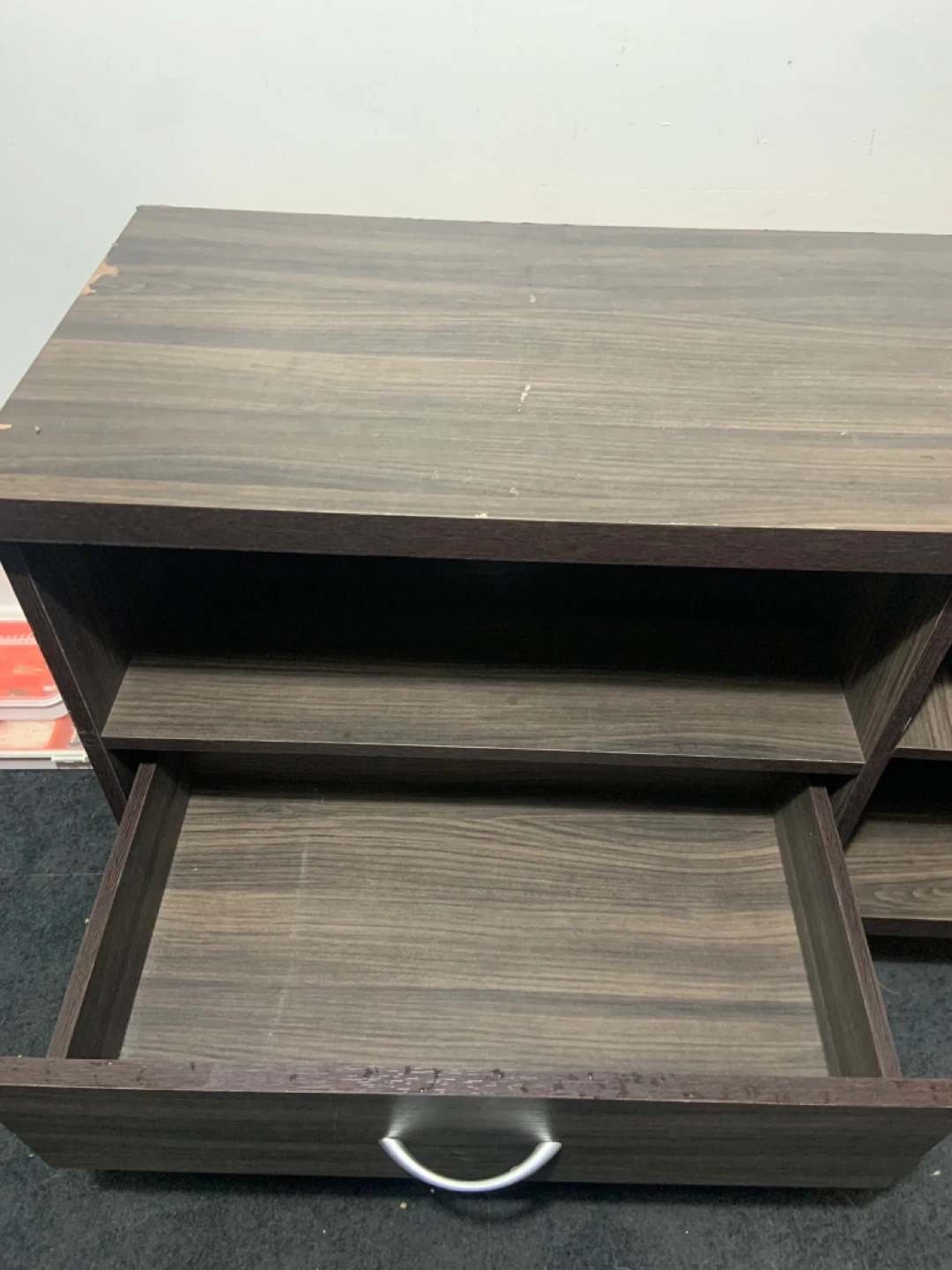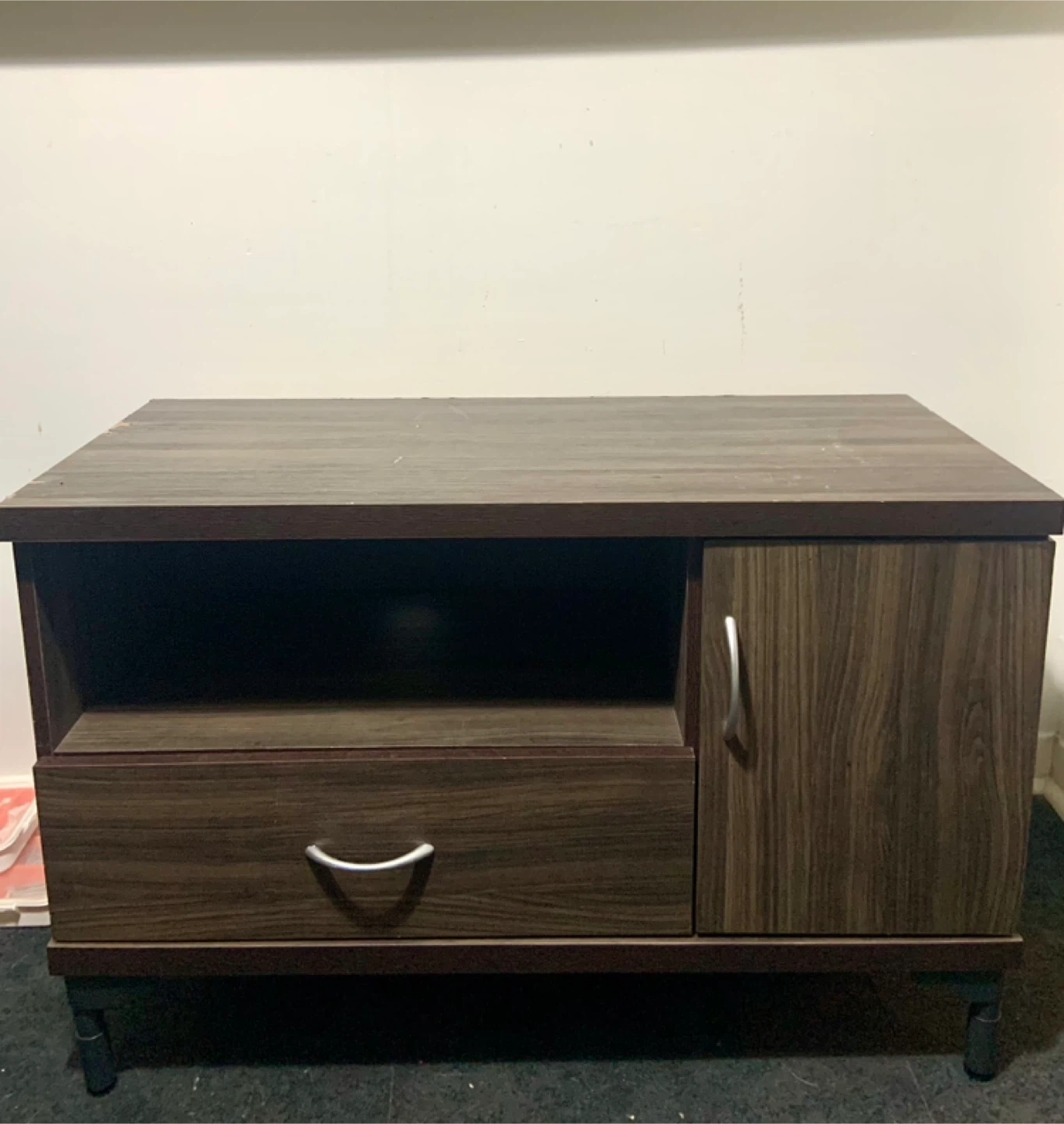 Selling a wood TV stand with a cabinet and drawer. It has a dark brown wood grain finish.