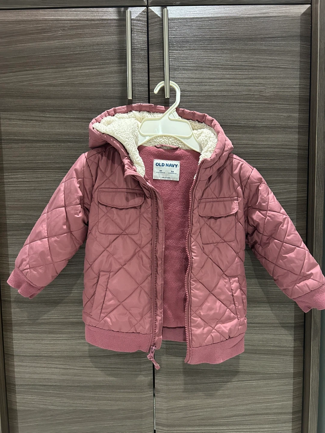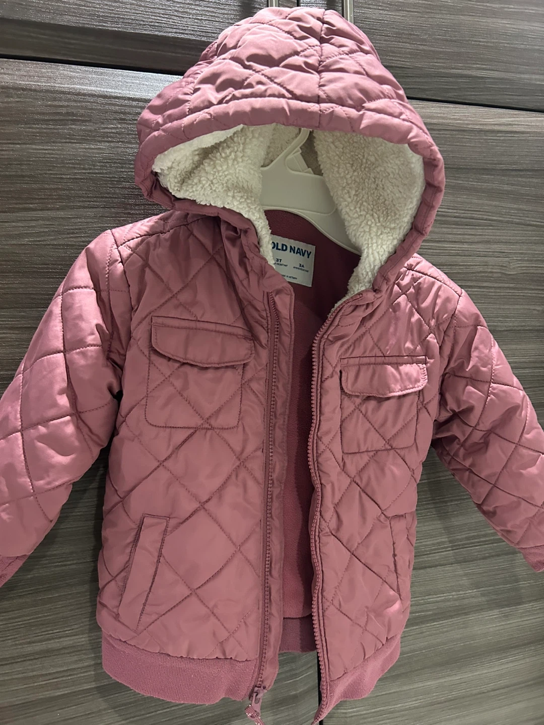 Selling a cute Old Navy quilted jacket for a toddler girl! It's a size 3T and features a water-resistant outer layer and a cozy, sherpa-lined hood. Perfect for keeping your little one warm and stylish on chilly days!