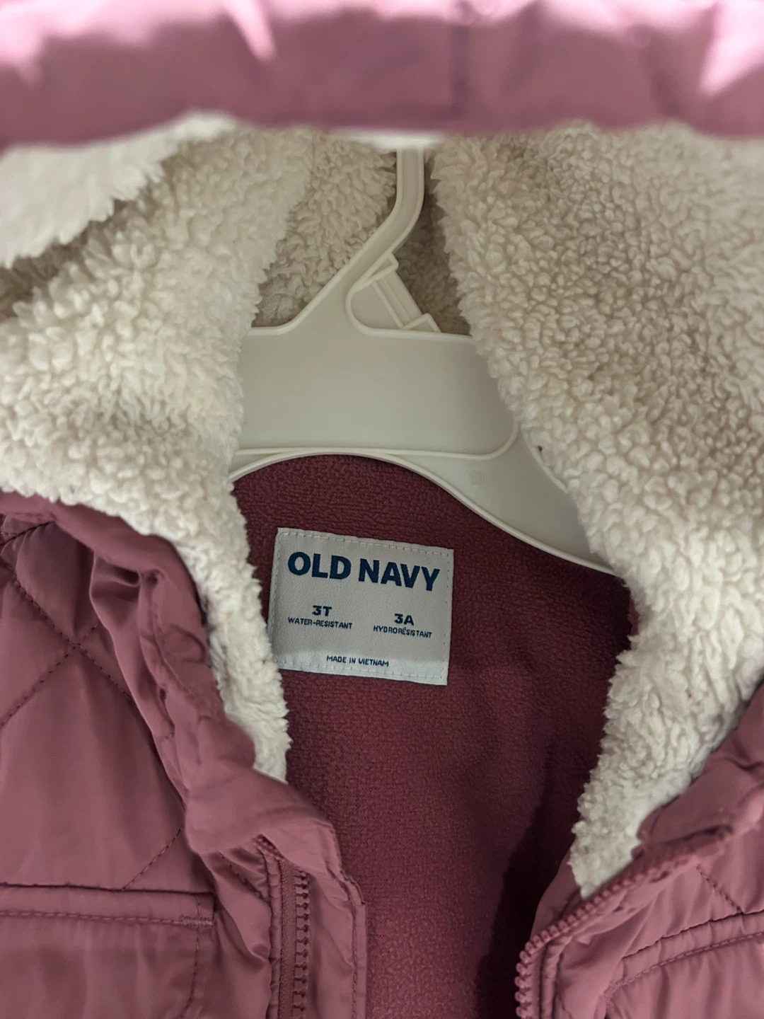 Selling a cute Old Navy quilted jacket for a toddler girl! It's a size 3T and features a water-resistant outer layer and a cozy, sherpa-lined hood. Perfect for keeping your little one warm and stylish on chilly days!