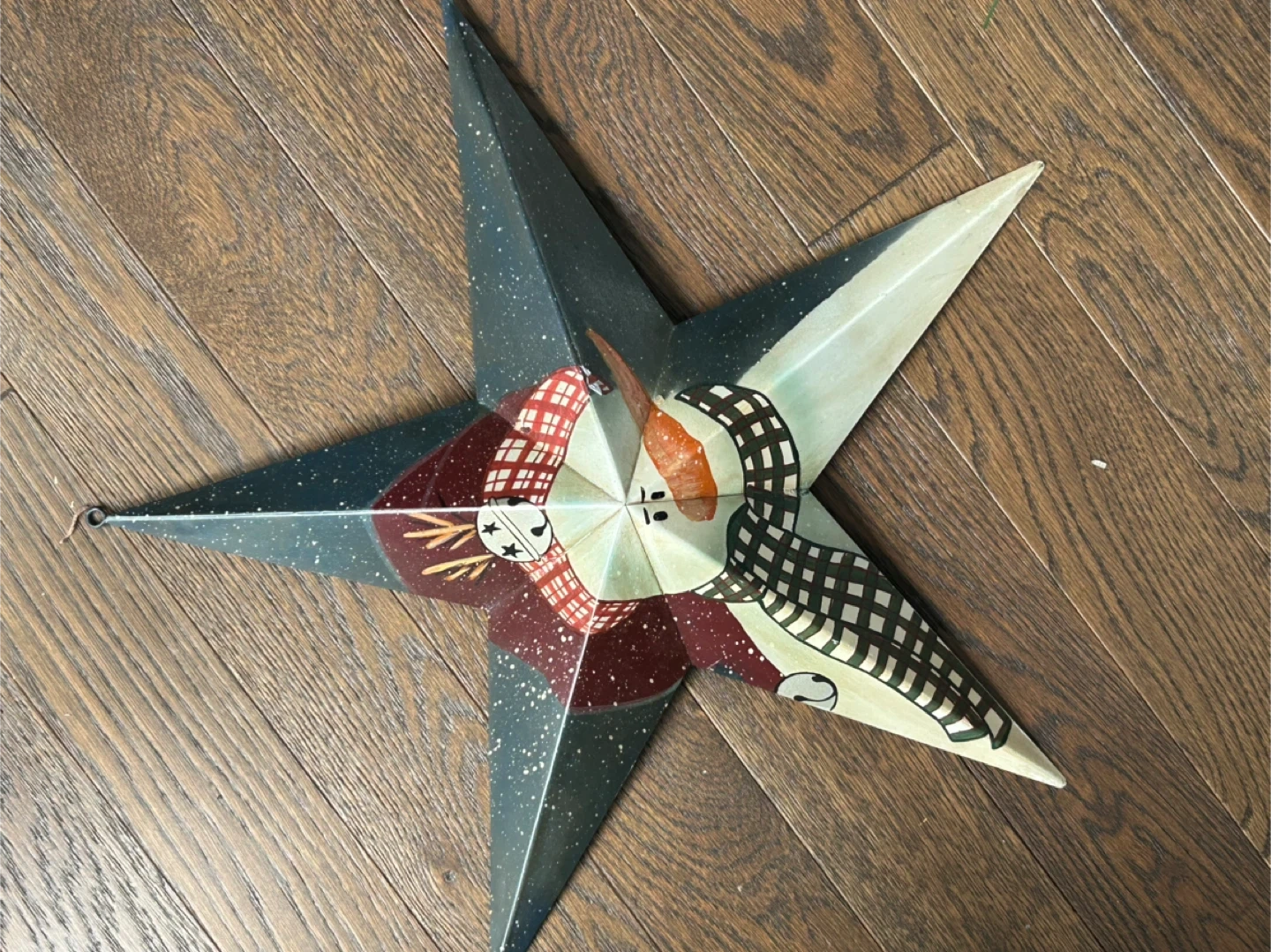 This is a decorative metal star with a cute snowman design, perfect for adding a touch of winter charm to your home