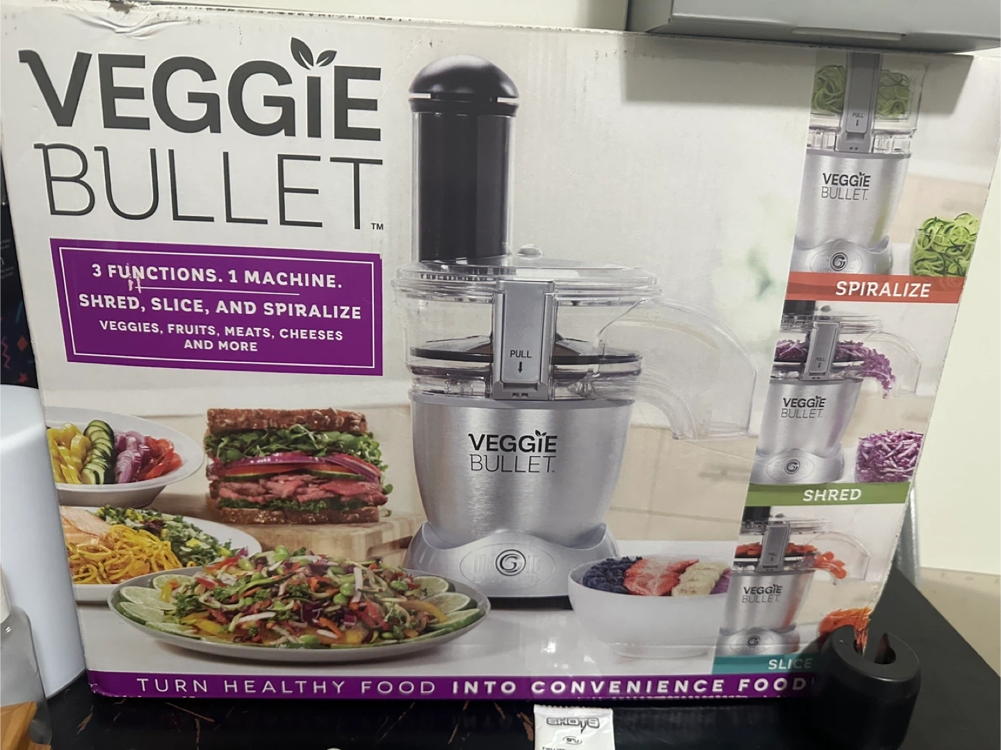 I'm selling a Veggie Bullet that can shred, slice, and spiralize veggies, fruits, meats, cheeses and more! It has 3 functions in 1 machine. Turn healthy food into convenience food with this handy appliance!