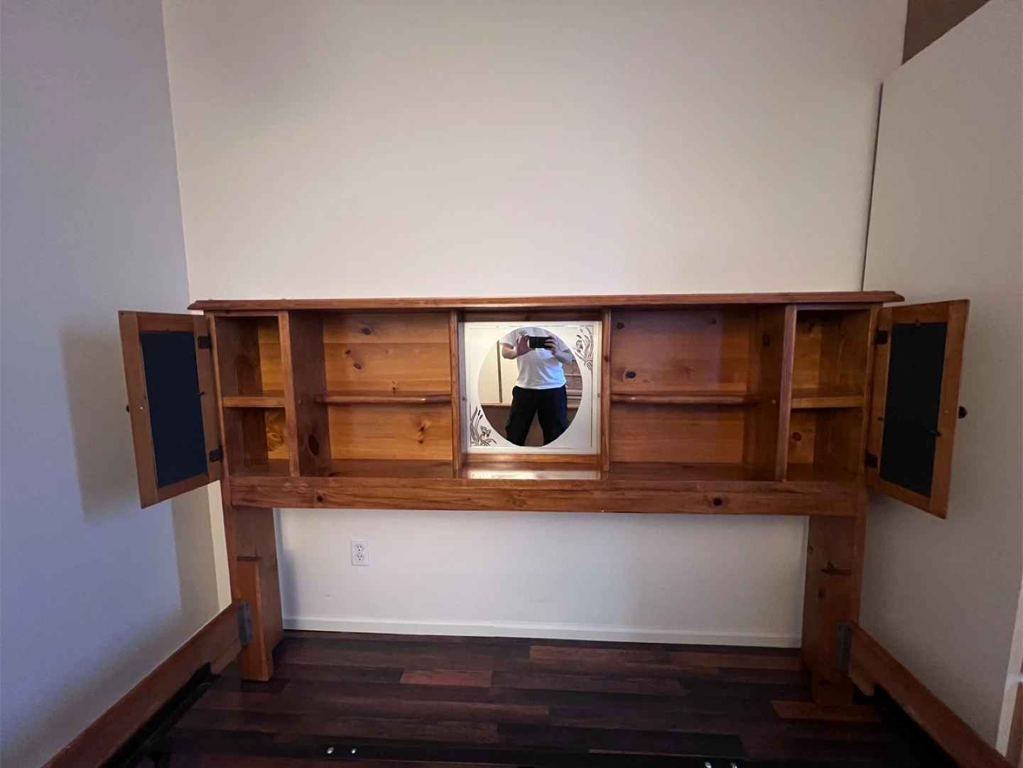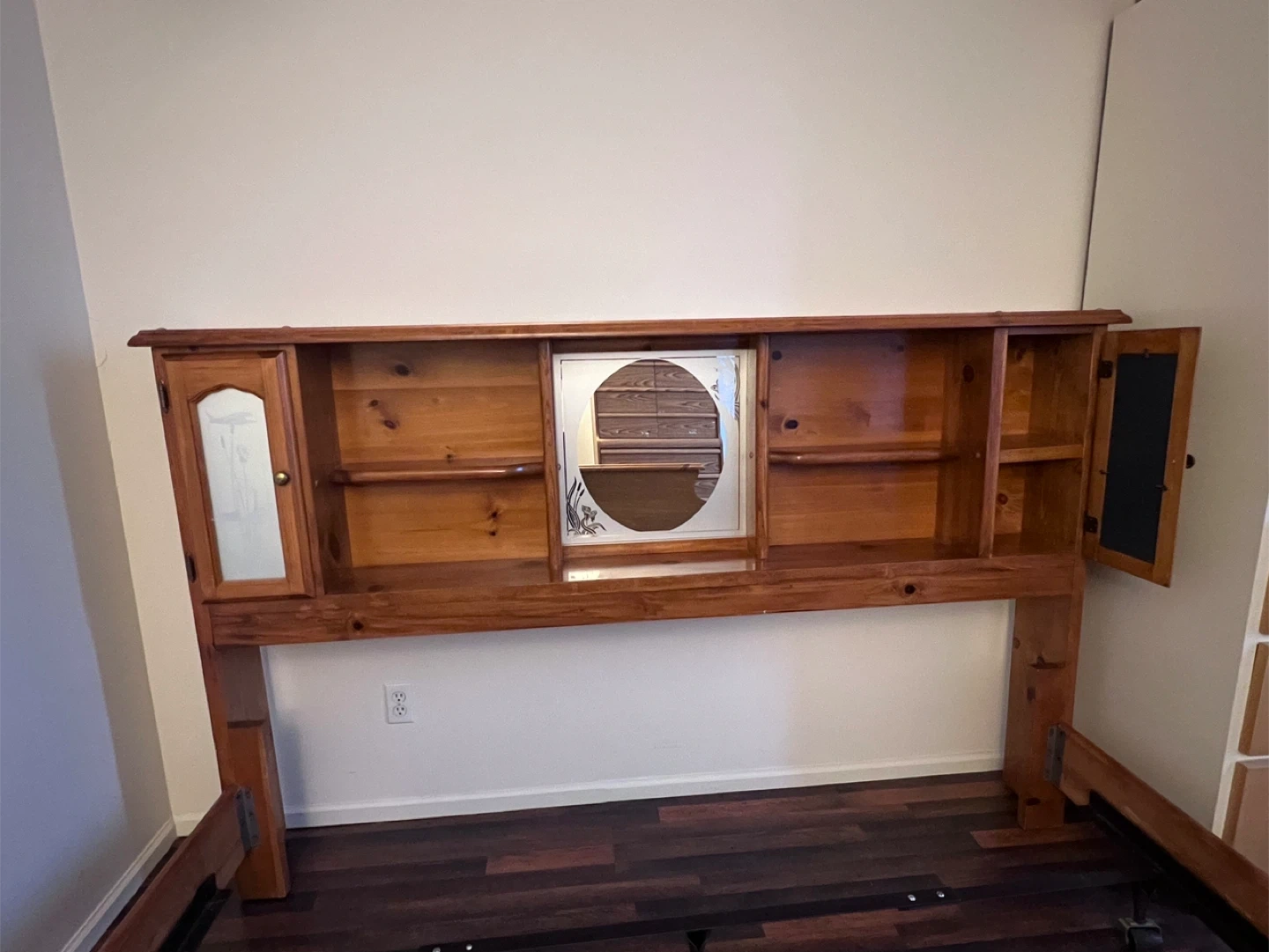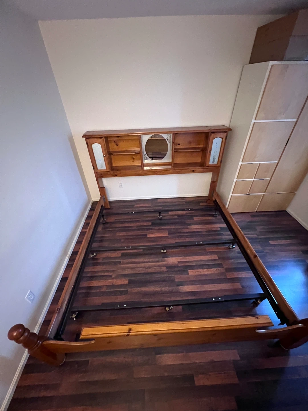 Selling a king size wooden headboard with a bed frame. It's in good condition and ready to use! The headboard has built-in shelves and decorative details. Perfect for adding a touch of rustic charm to you.