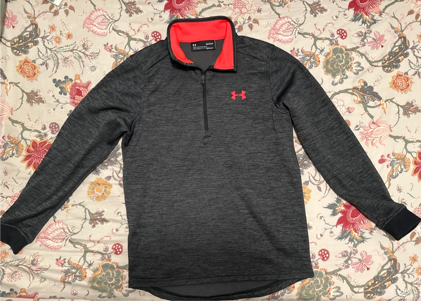 Brand New Under Armour 1/4 zip pullover in size small to medium. It's in great condition and perfect for layering on cooler days. The colour is a dark heather grey with a orange logo and collar. Feel free to reach out if you have any questions!