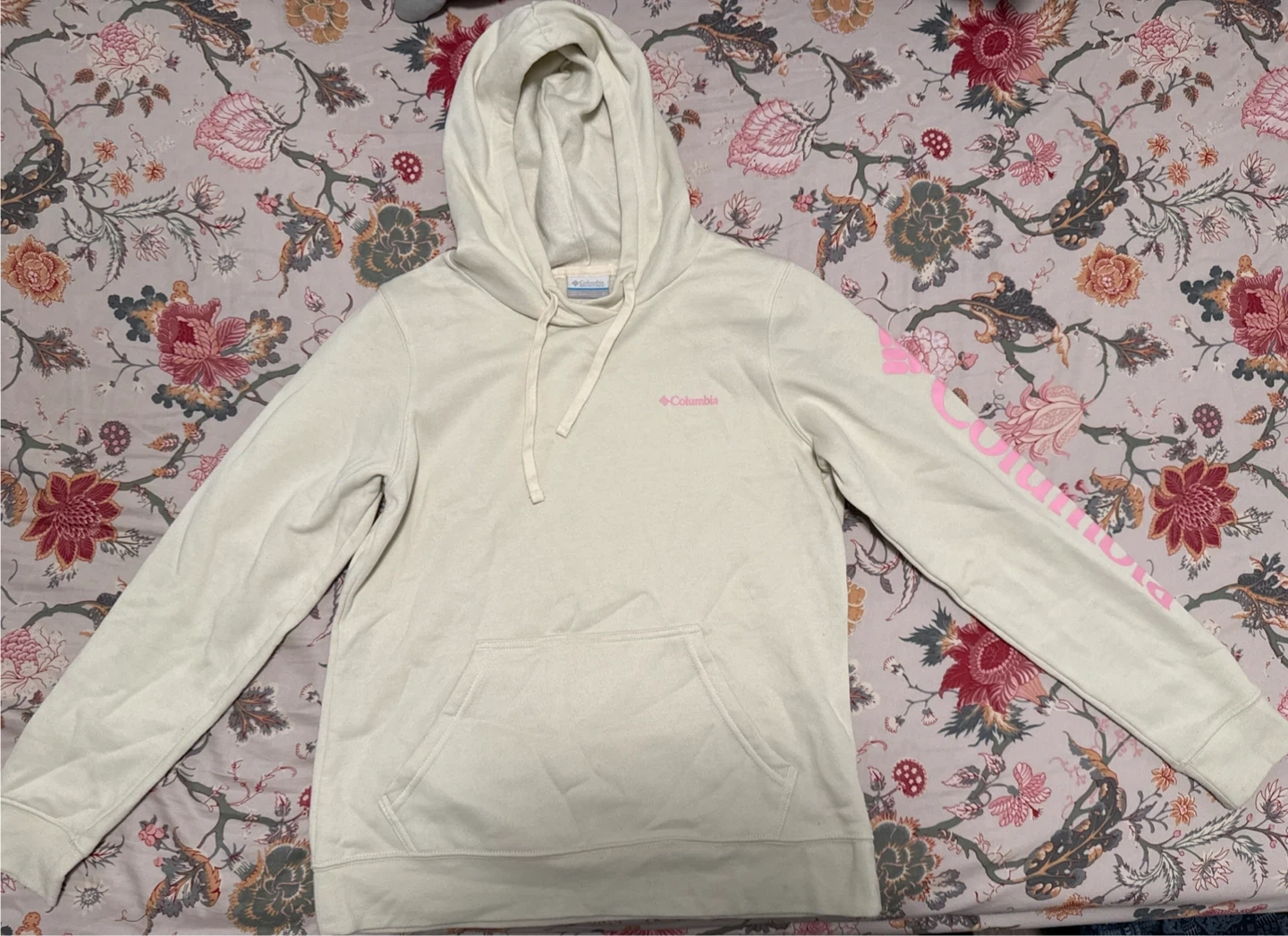Cozy Columbia hoodie in a lovely cream colour. It features the Columbia logo in pink on the chest and down the sleeve. Perfect for layering in winters or wearing on its own!