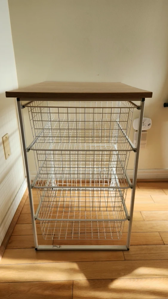 This is a metal storage unit with four wire baskets and a wooden top. It's perfect for organizing items in your home. The unit is in good condition and ready to use.
