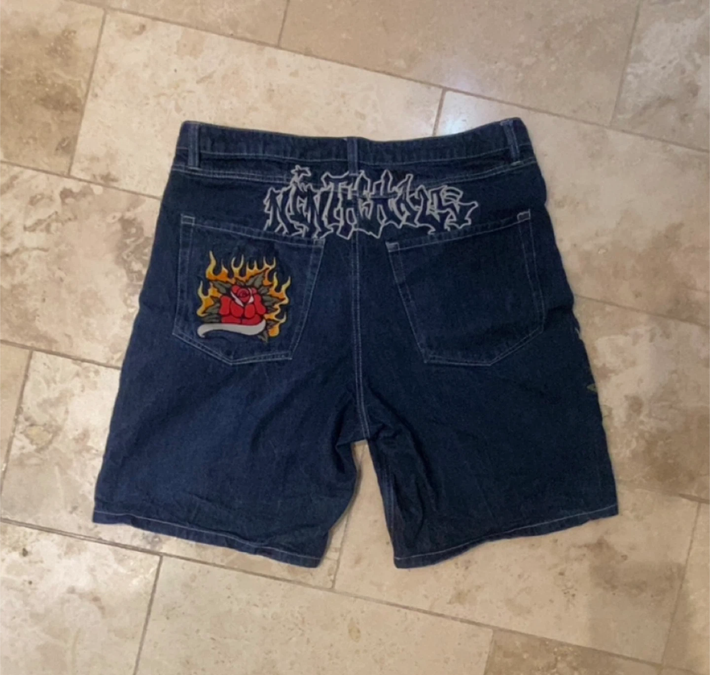 Selling a pair of Ninth Waylay denim shorts. They feature unique embroidered designs. Great for a casual, stylish look!