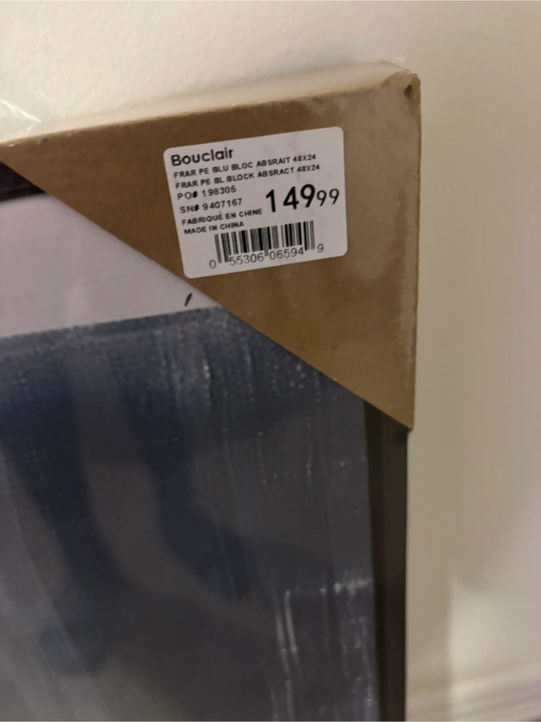 Selling a beautiful Bouclair abstract wall art piece! It measures 48x24 inches and features a lovely blue colour palette. The material is canvas with acrylic paint and a PS frame.