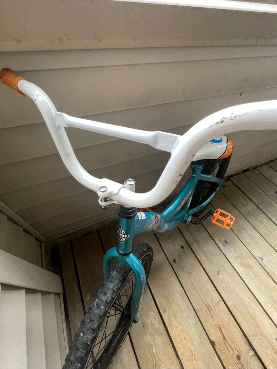Selling a Star Wars themed kids' bike! It's turquoise with Star Wars graphics. This bike is perfect for any young Star Wars fan who is learning to ride. It has some signs of wear, but is still in good condition for fun adventures