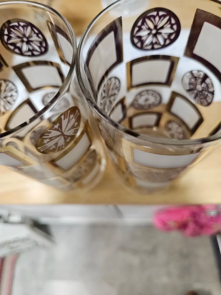 Selling a pair of vintage highball glasses! They feature a unique gold and white geometric design. These glasses are in great condition and would make a stylish addition to any home bar or kitchen