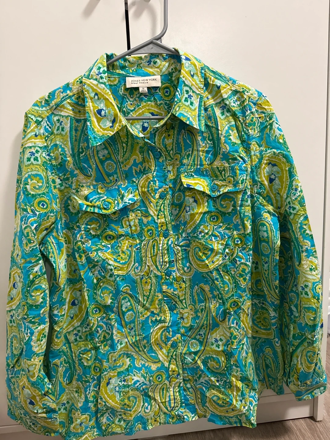 This is a Jones New York button-down shirt in size M-L. It features a vibrant paisley pattern with shades of turquoise and yellow-green. The shirt has two chest pockets and a classic collar. It's perfect for adding a pop of colour to your wardrobe!