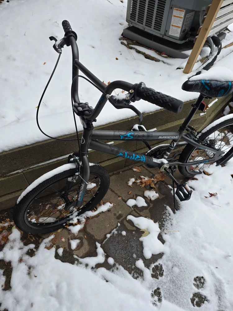 Selling a Supercycle BMX bike that's ready for some action! It's in great condition and perfect for anyone looking to ride around the neighbourhood or hit the local skate park. The bike is a stylish gray colour with blue accents. It's a sturdy and reliable ride!