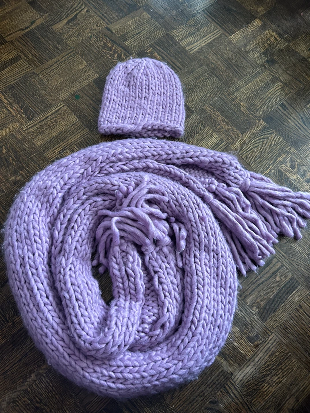 Selling a lovely handmade knit scarf and hat set! The set is a beautiful shade of purple and features a chunky knit texture. Perfect for staying warm and cozy during the colder months. The set includes a matching hat with a simple, classic design and a long, fringed scarf.