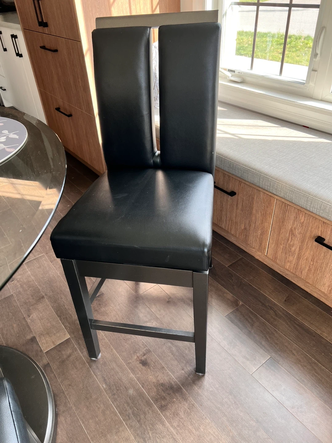 Selling a round glass dining table with four grey chairs. It's in great condition and would be a lovely addition to any home! The chairs are a sleek grey colour and the seats are rotatable.