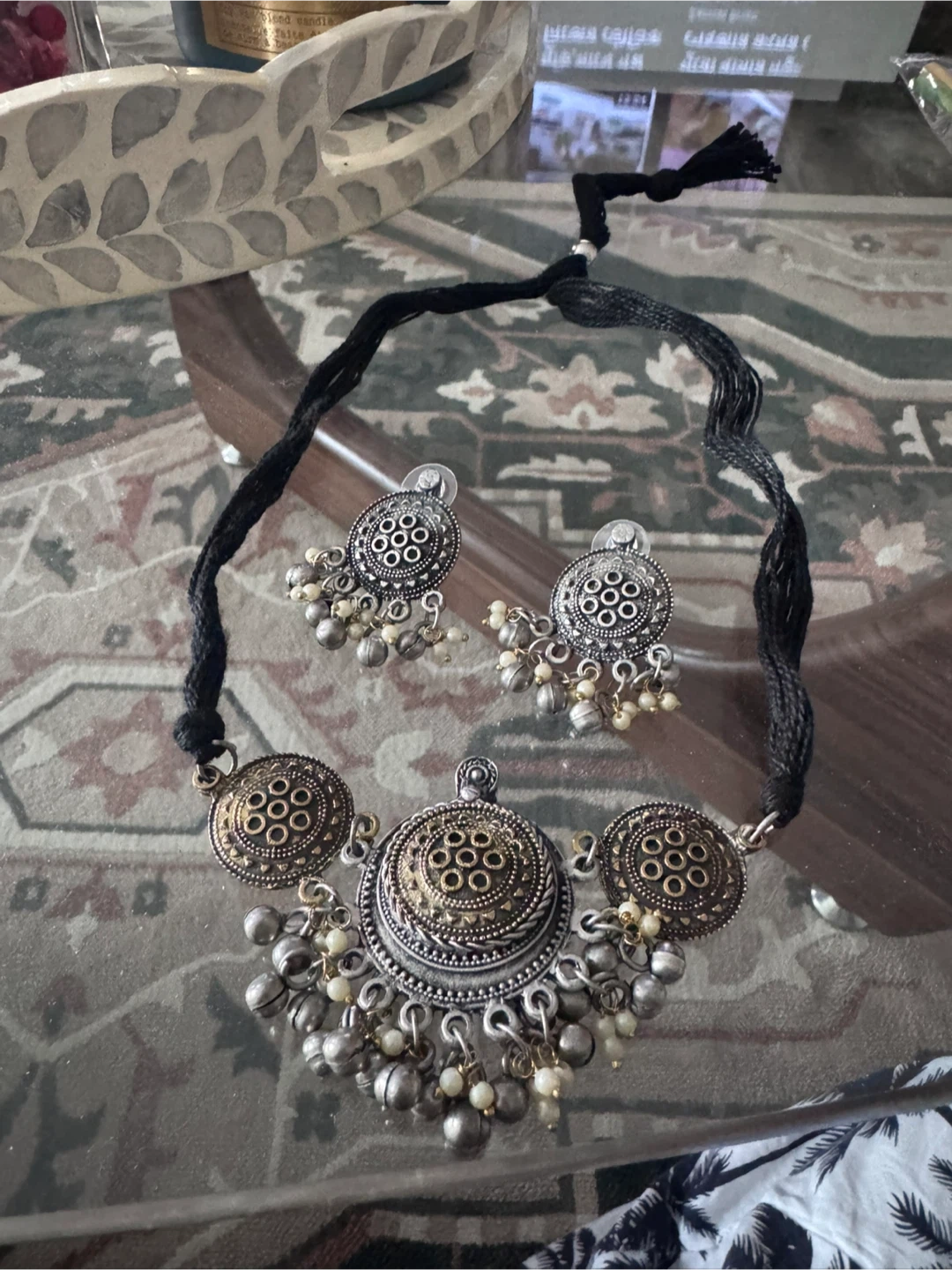 Selling a oxidized beautiful necklace and earring set! The set features a unique design with silver and gold accents, perfect for adding a touch of elegance to any outfit