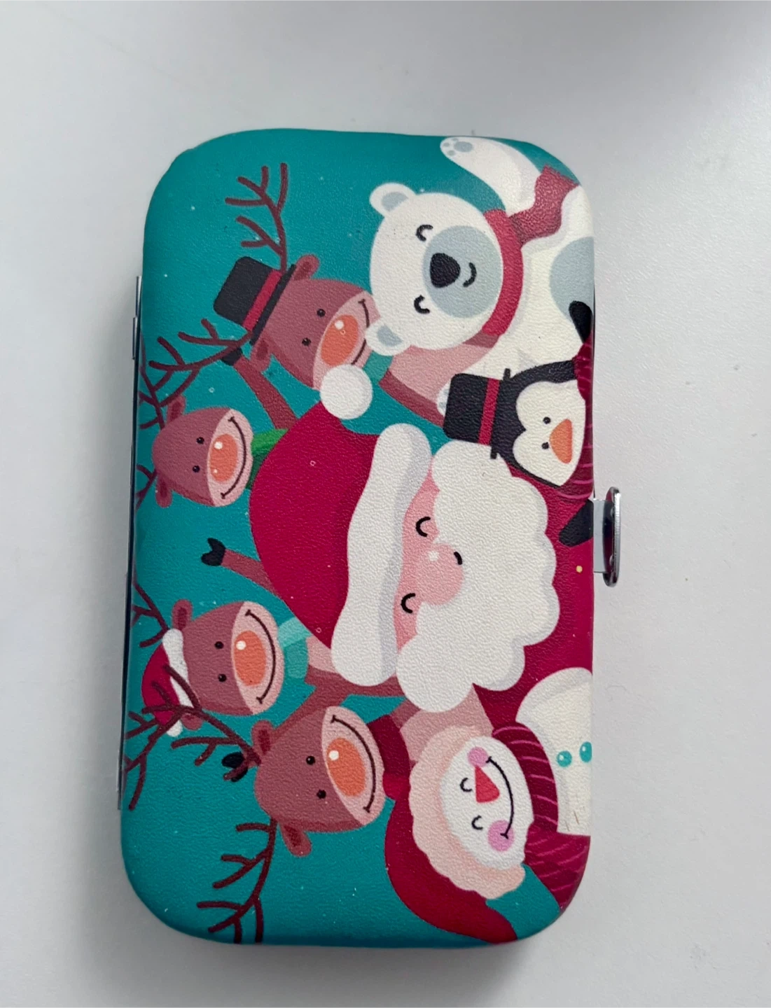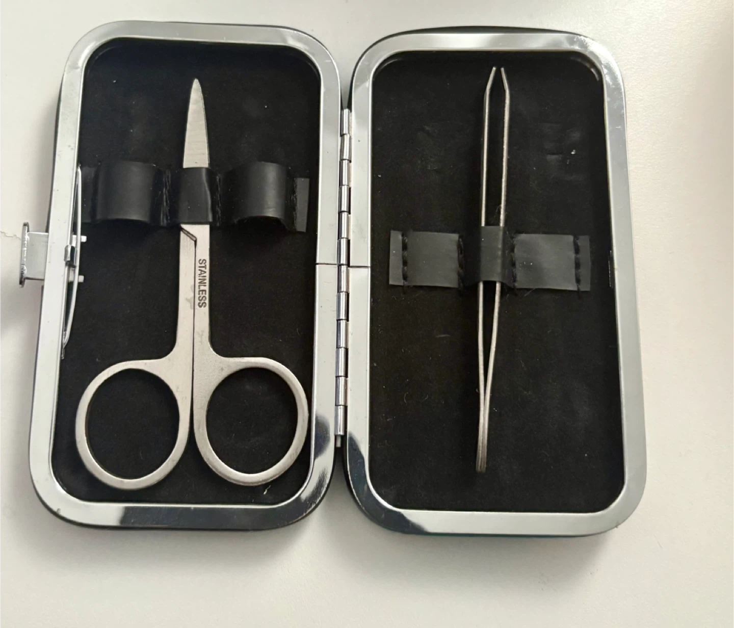 It comes with stainless steel scissors and tweezers, all neatly organized in a festive case.
