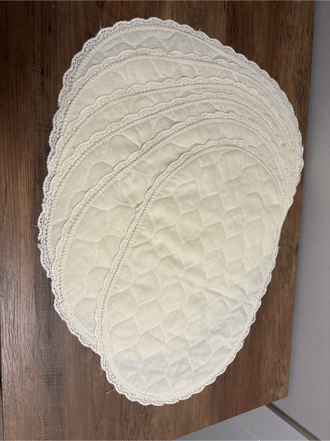 I'm selling a set of 7 oval placemats, perfect for adding a touch of elegance to your dining table! They feature a delicate lace trim and a quilted pattern. These placemats are new and ready to use. They are cream colored.