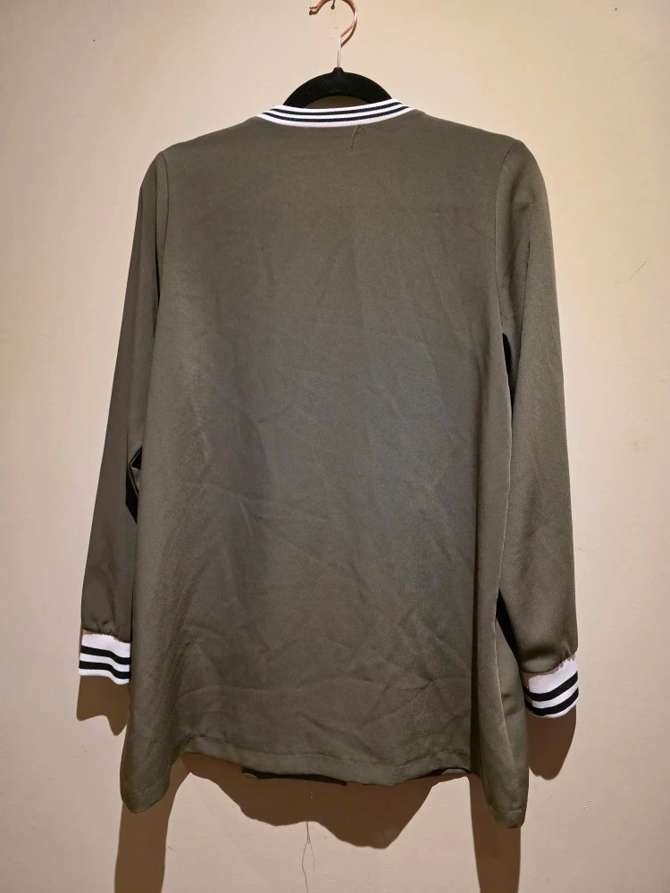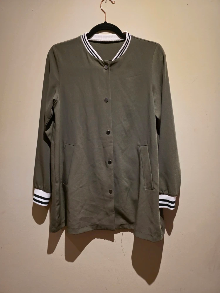 Here's a comfy olive green bomber jacket! It has a button-up front and striped detailing on the collar and cuffs. It's perfect for layering or wearing on its own during those cooler days.