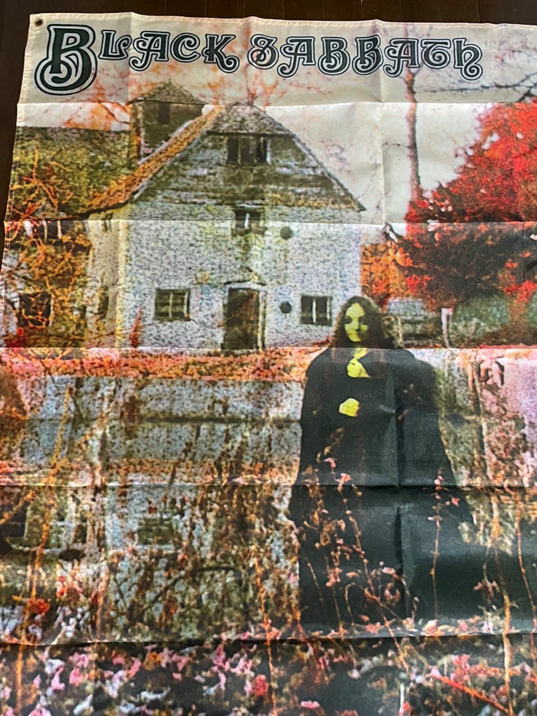 Selling a Black Sabbath poster. It features the band's name at the top and an image of a house and a figure in the foreground. It's in good condition and would be a great addition to any music fan's collection