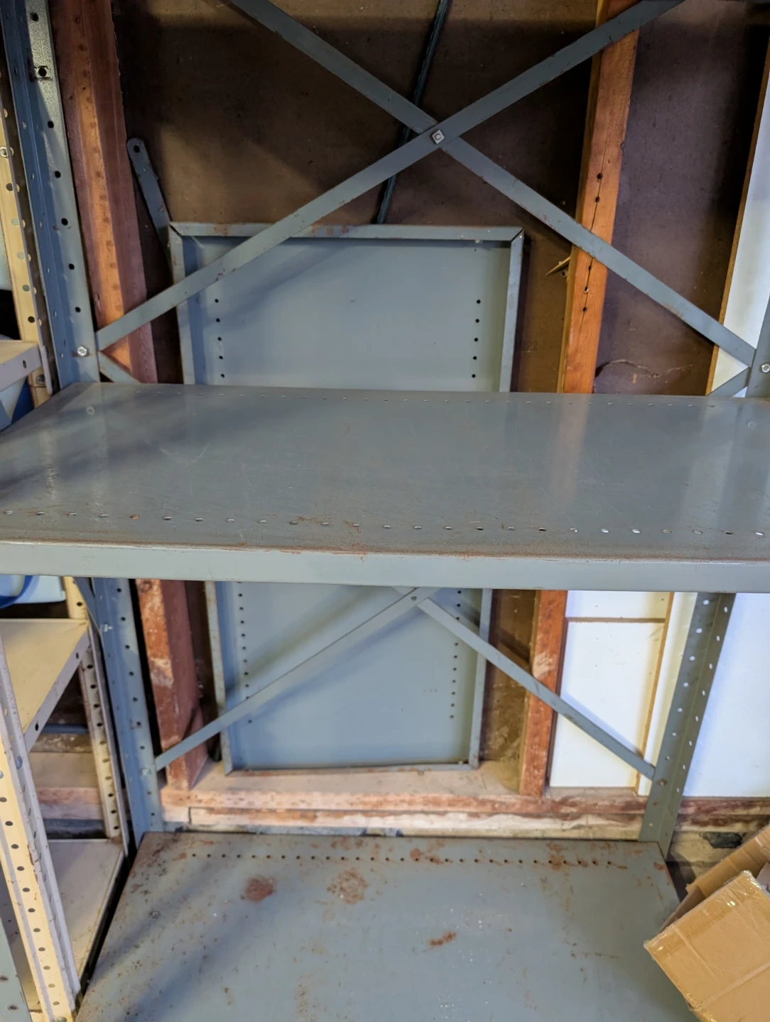 Selling a sturdy and tall metal garage shelving unit! It's perfect for organizing your tools, storage bins, or anything else you need to keep tidy in your garage or workshop. It has some signs of use, but is still very functional
