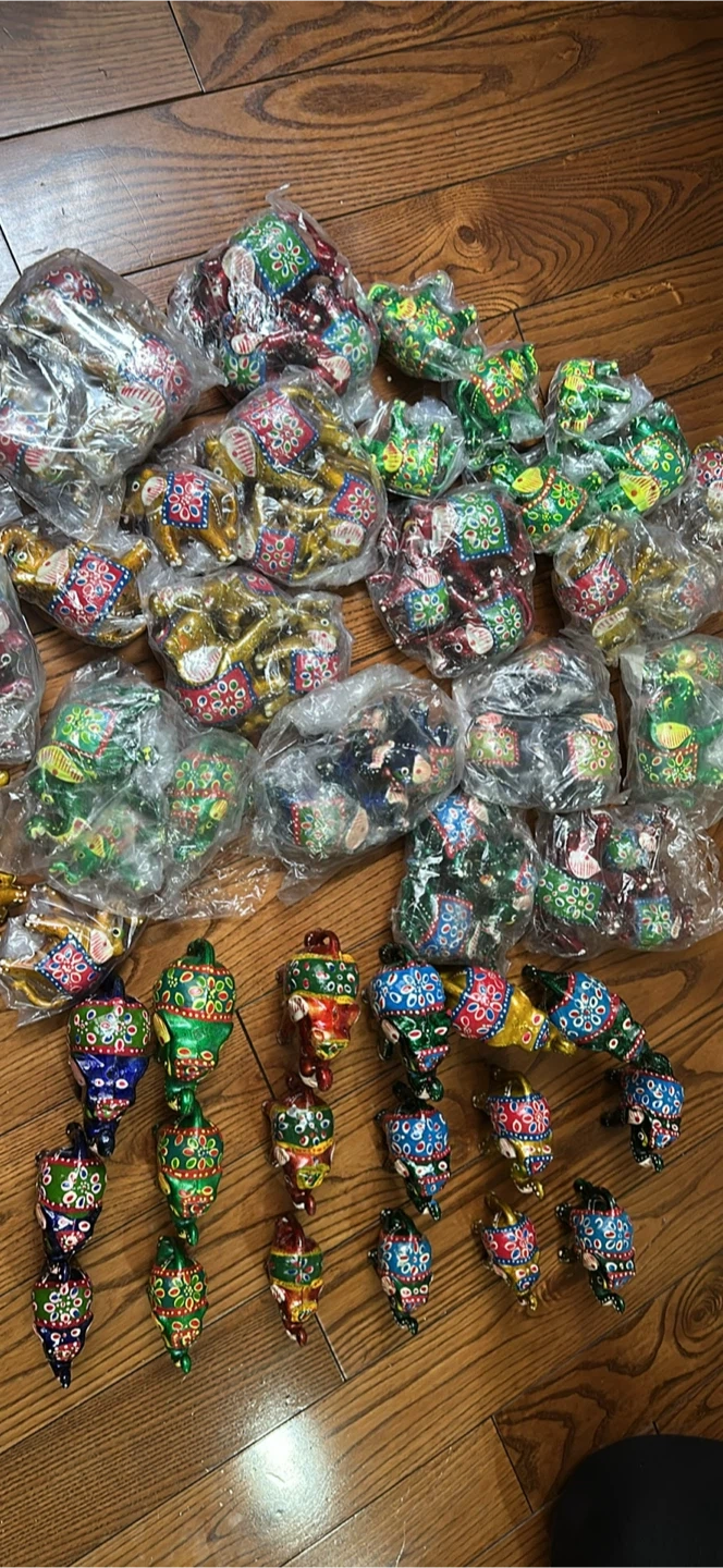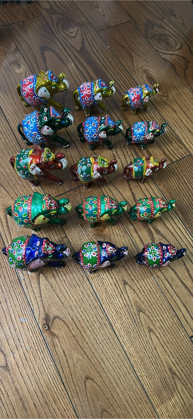 These are hand-painted elephant figurines, perfect for adding a touch of colour to your home! They come in various colours, including green, blue, and red, all with unique decorative patterns. They're in great condition and ready to brighten up any space.