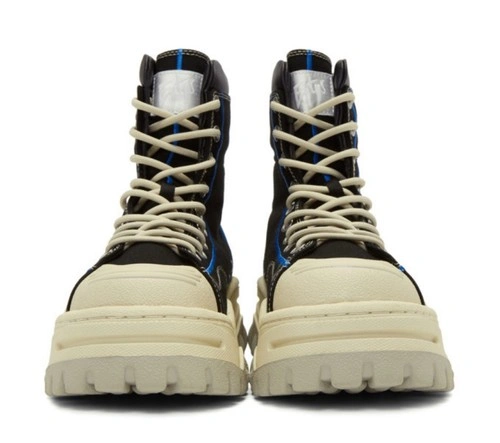 High-top canvas sneakers in black. Stripes embroidered in blue throughout. Round rubber cap toe in off-white. Lace-up closure in off-white. Tonal leather padded collar. Grosgrain pull-loop in purple at heel collar. Rubber midsole in off-white featuring logo embossed at heel. Treaded rubber outsole in grey. Silver-tone hardware. In excellent condition, worn only twice.