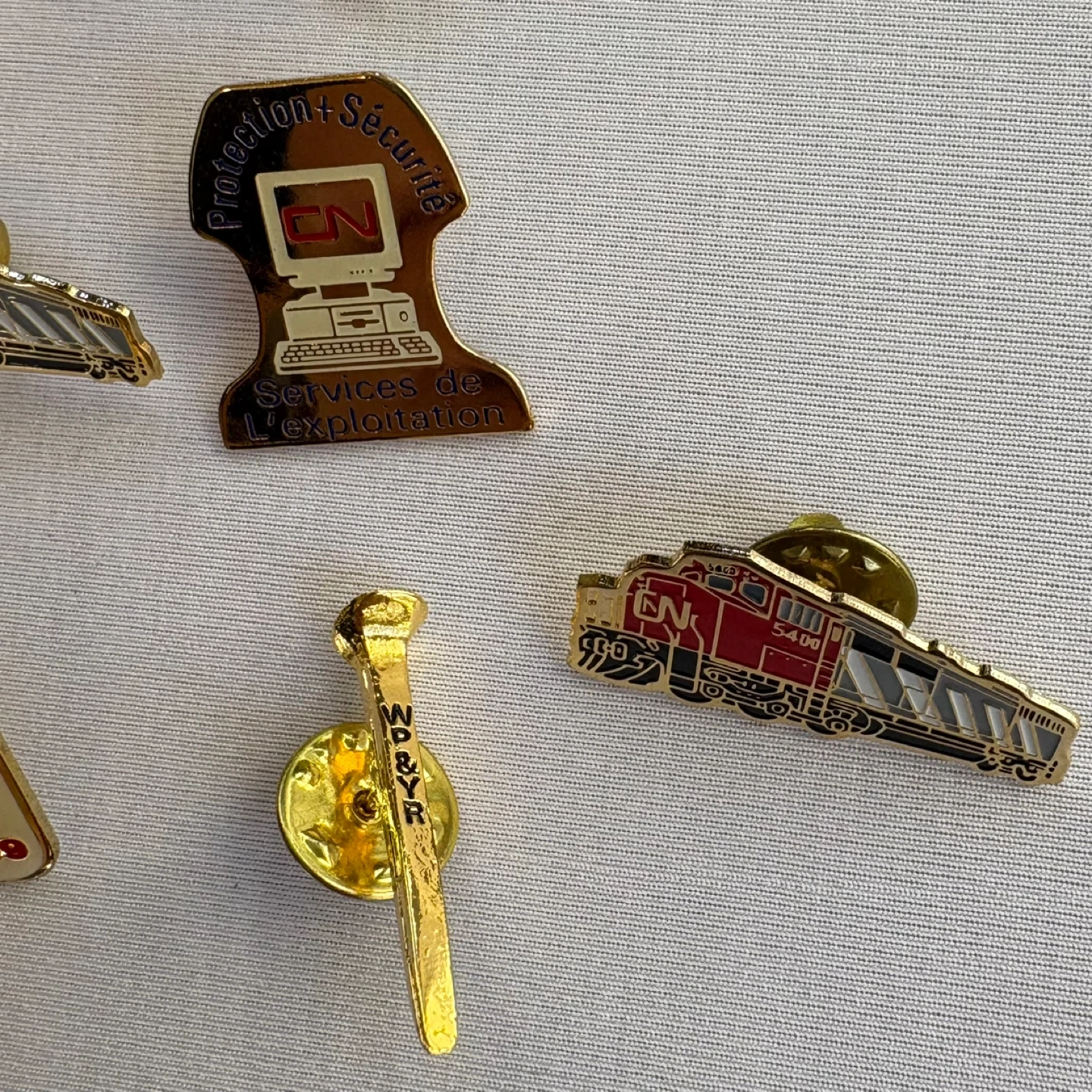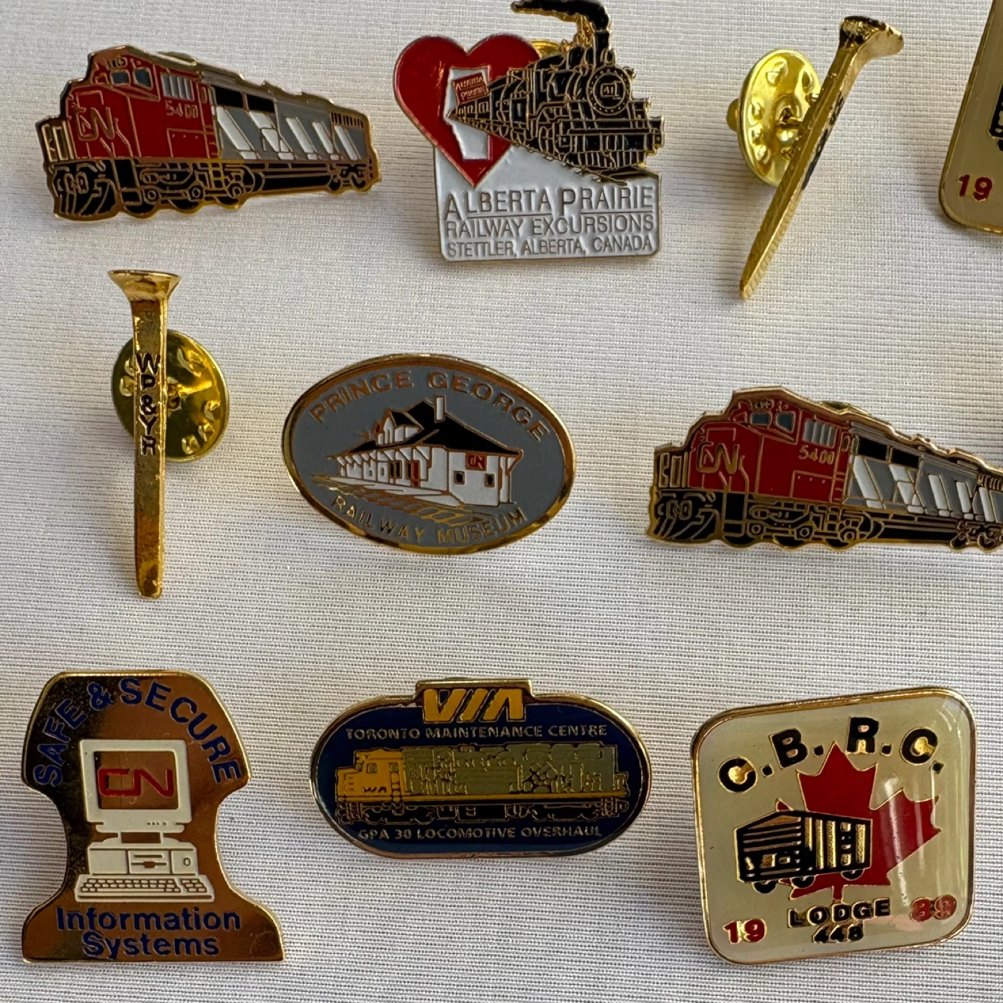 vintage pins railway memorabilia CN rail Canadian National railway VIA Rail train pins CBRC railway union pins Alberta Prairie railway Prince George Railway Museum railway spike pin collector lot transportation history Canada