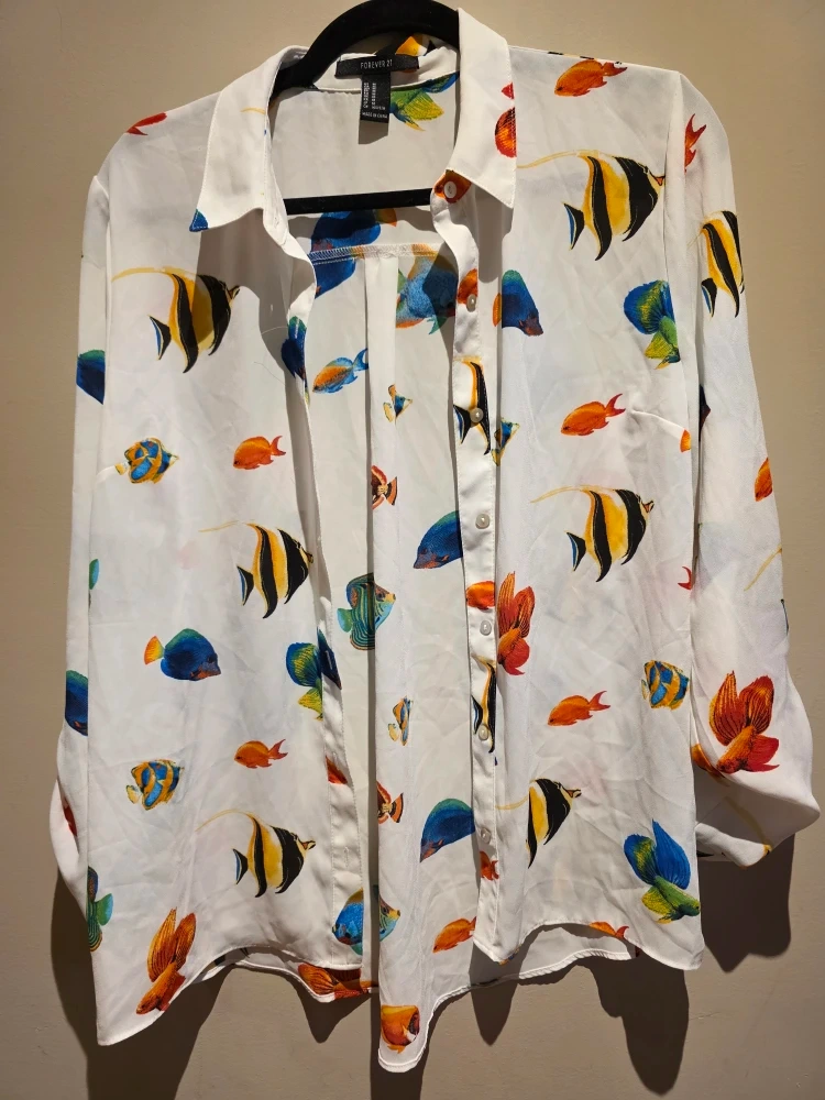 Cute Forever 21 blouse with a fun fish print! It's a size medium and in great condition. Perfect for adding a pop of colour to your wardrobe!