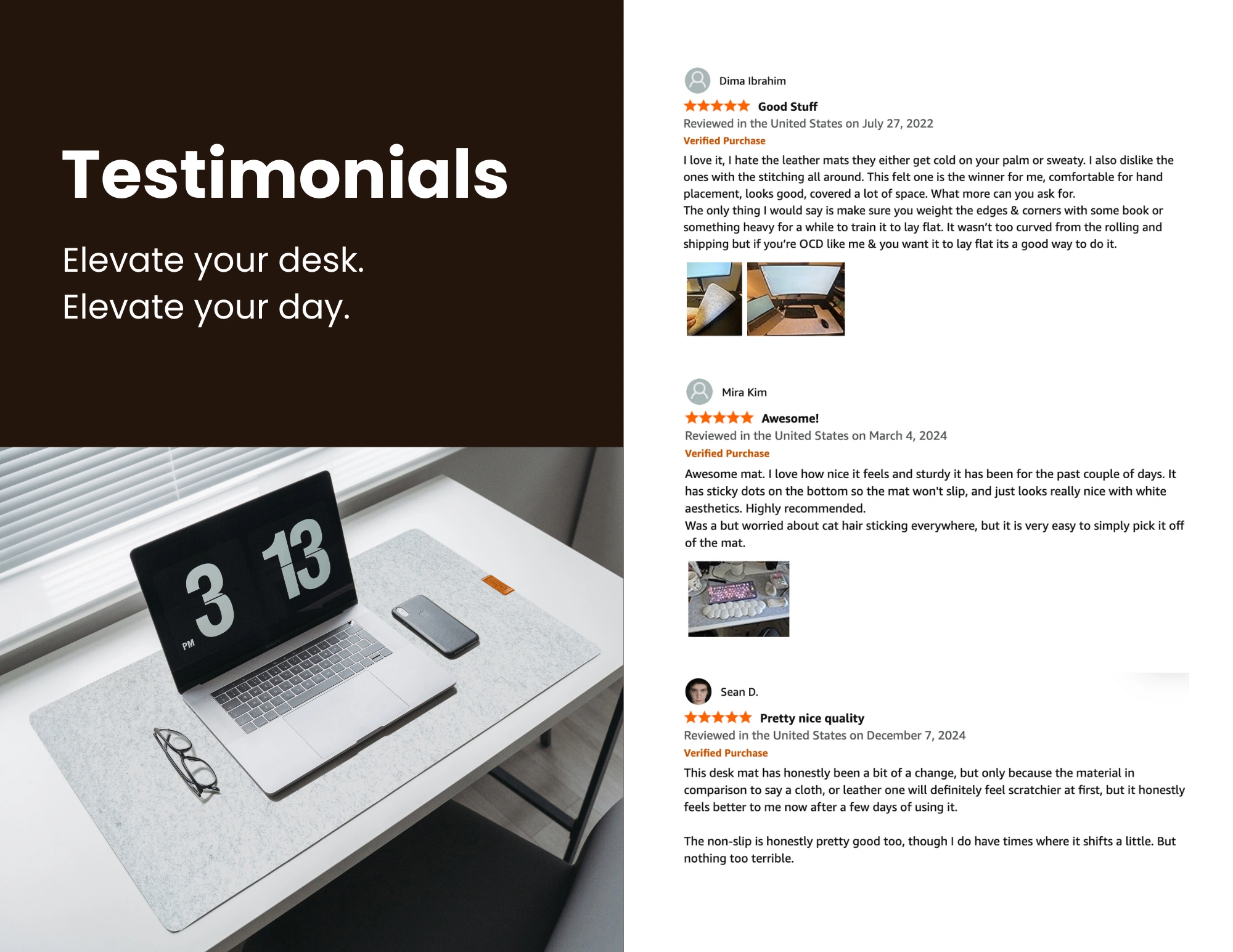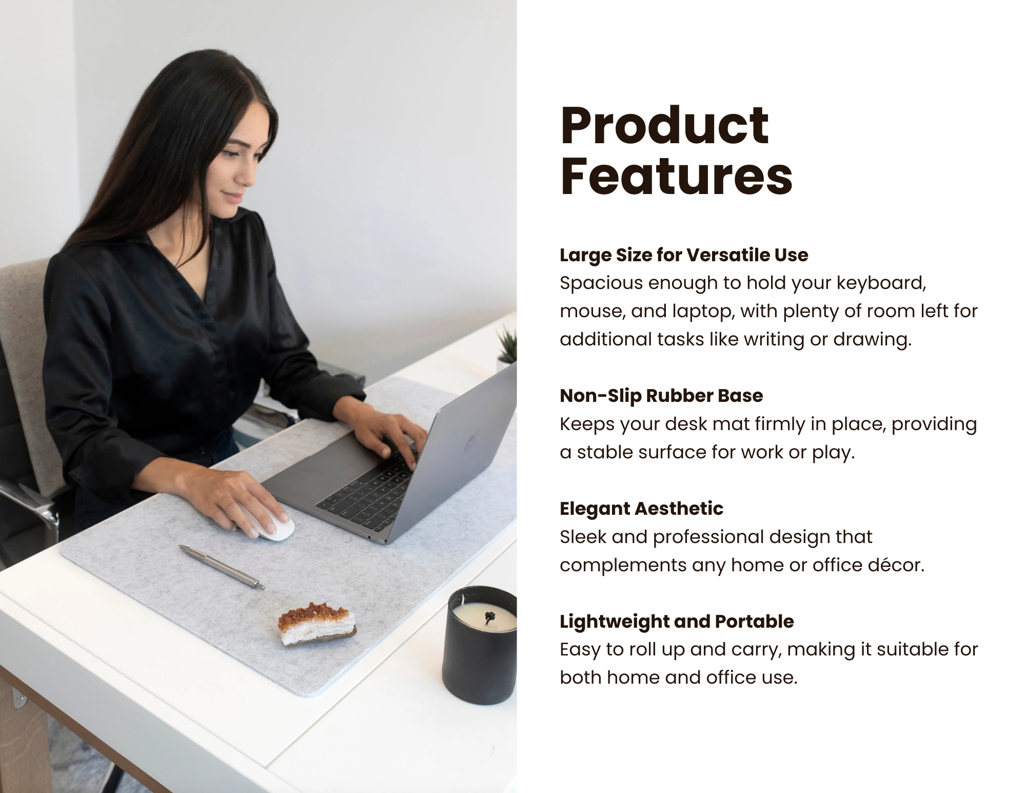 Shield your workspace from everyday hazards with our felt desk mat. It effectively guards against scratches and spills, keeping your desk surface pristine under all conditions, whether you're dealing with morning coffee mishaps or the wear-and-tear of daily tasks.