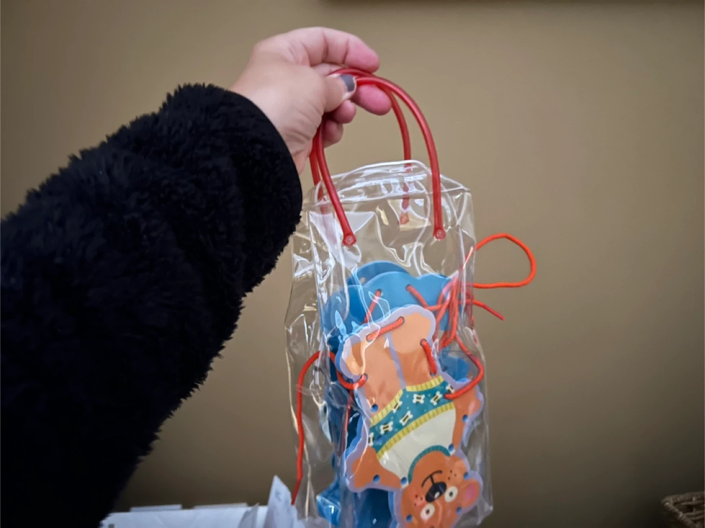 Here's a cute lacing toy set for kids! It comes in a clear bag with red handles. The set includes various shapes like an astronaut and a bear, perfect for developing fine motor skills and hand-eye coordination