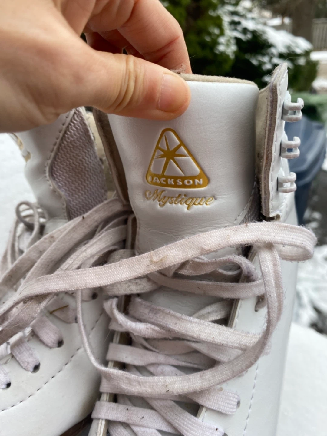 Selling a pair of Jackson Mystique ice skates in size 3. They're white with brown soles and show some signs of use, but are still in good condition for hitting the ice!