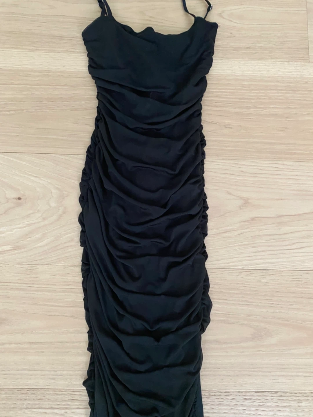 Selling a cute black ruched mini dress! It's in great condition and perfect for a night out or a special occasion. The ruching detail is super flattering!