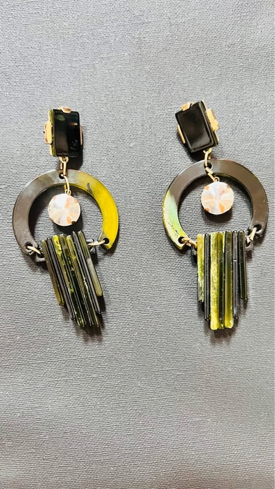 I am so sad to let these go, but they’re too big for my tiny earlobes 😩. Acrylic retro-style earrings, pendant model - the pendants are individual and have a bit of super cool movement when on! Metals with a gold finish. Handmade by Spanish artisans. Purchased in San Sebastián, Spain. 🎁 Get your unique holiday gifts early & on sale! 🎁 Like New - Gently used and sanitized with 99% isopropyl alcohol. •••••••••••• 💰 **Open to reasonable offers** 🏙️ **Location:** For those in NYC, local pickup is available in the vibrant streets of Brooklyn/Queens border. 🛍️ **Please Note:** All sales are final.