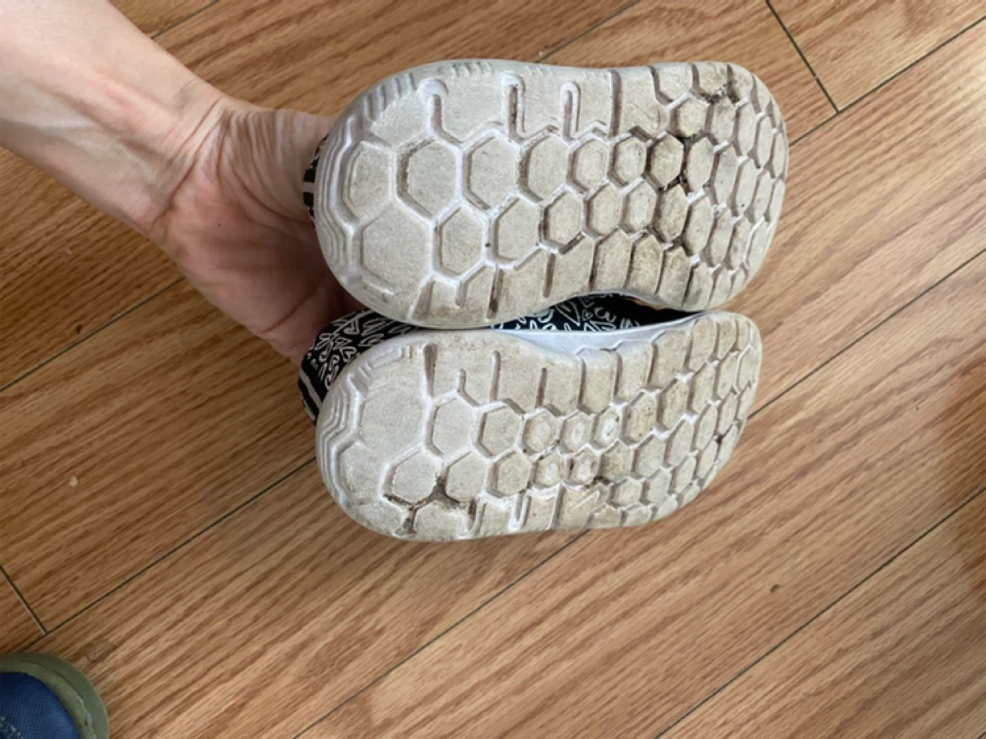 Selling a pair of Nike Flex Runner shoes for kids in size 9C. They're black with a white Nike swoosh and a heart pattern. The shoes have a velcro strap for easy closure, perfect for little ones on the go. They show some signs of wear on the soles, but are still in good condition for everyday play!