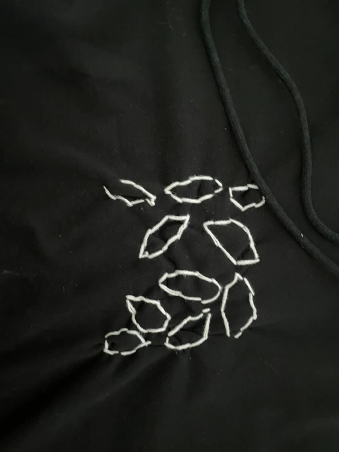 Selling a black hoodie featuring a weird white embroidered design. It's in great condition and ready for a new owner! Perfect for staying cozy and stylish.