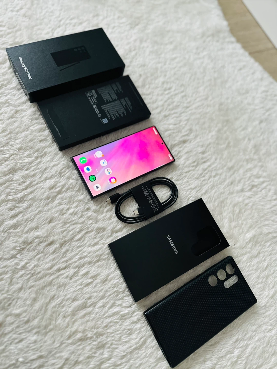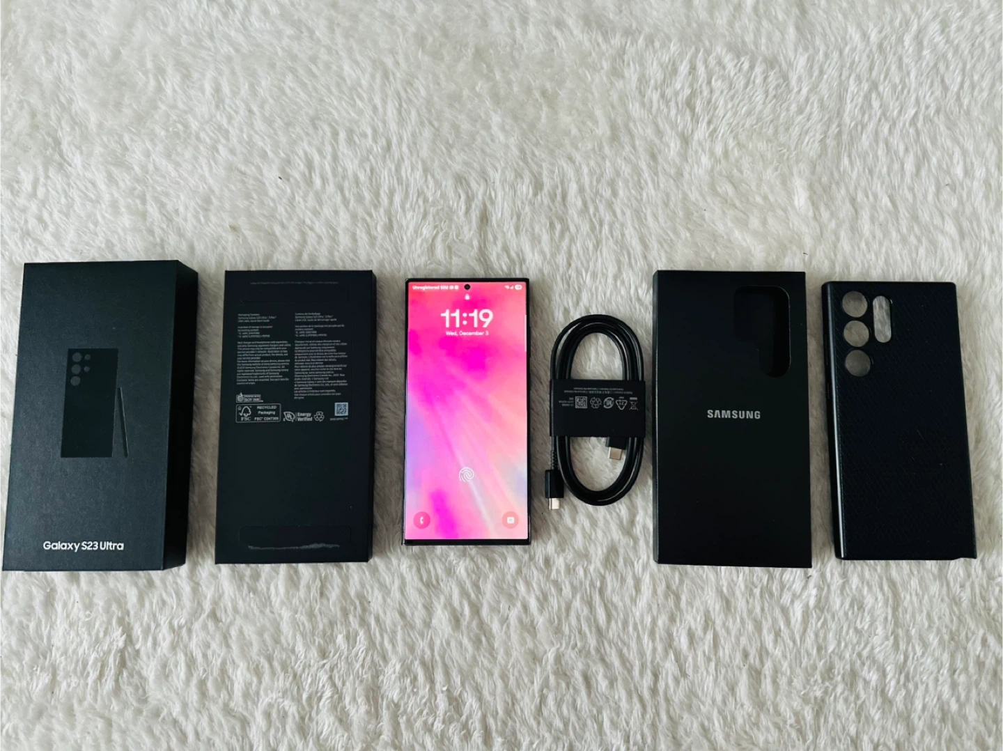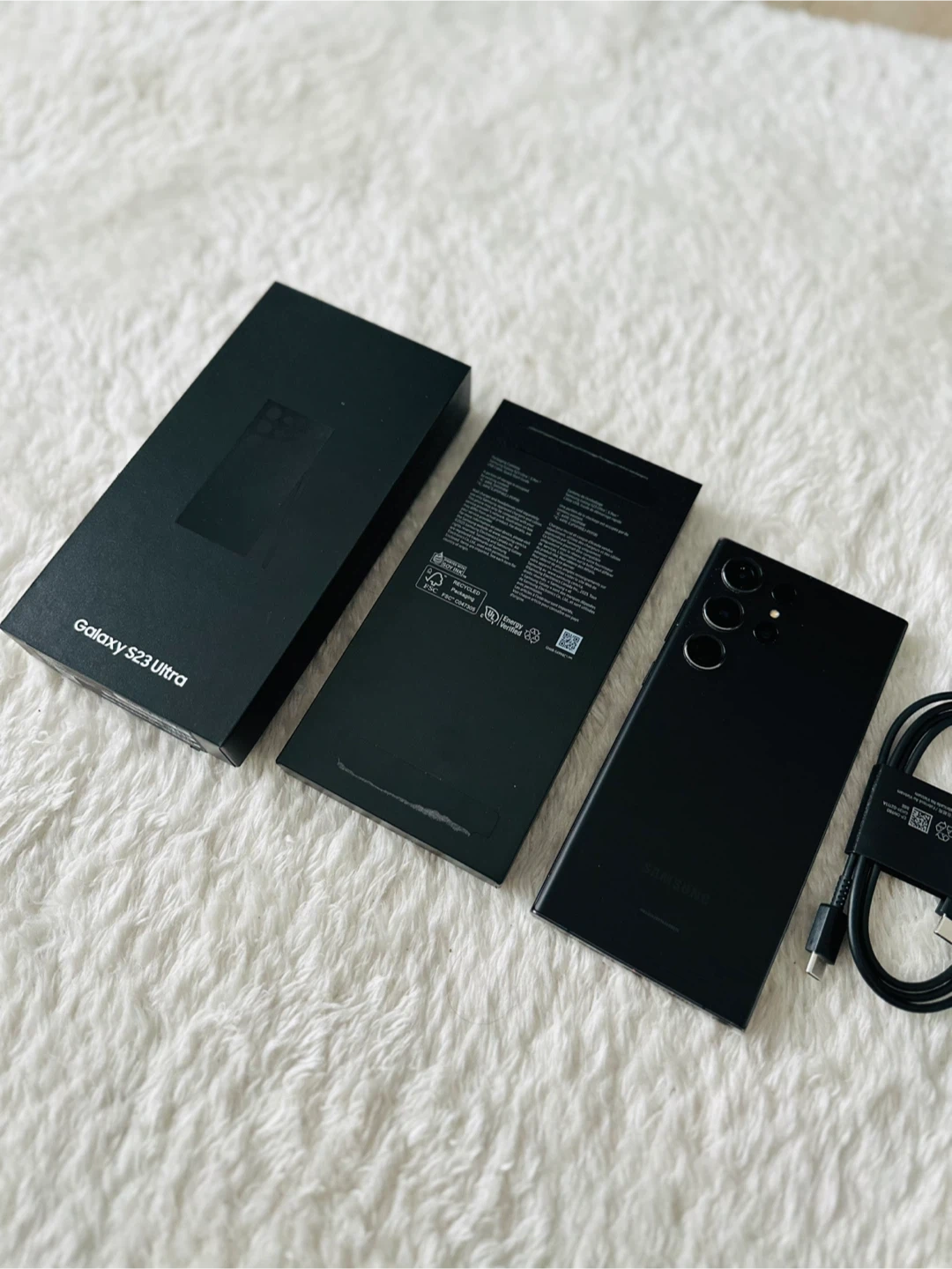 Selling a like-new Samsung Galaxy S23 Ultra in black! It comes with the original box and all included components, like the charging cable. There's also a Samsung case included for extra protection!