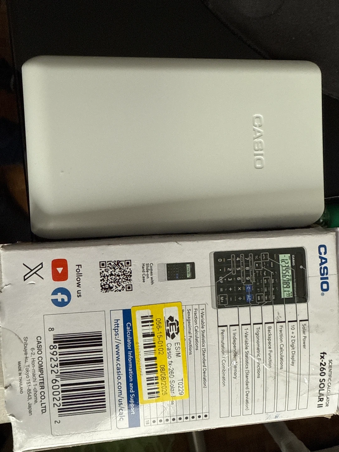 Selling a Casio fx-260 Solar II scientific calculator in excellent condition! It comes with its slide-on hard case. It's a solar-powered calculator with a 10+2 digit display, fraction calculations, and trigonometric functions. It also has 1-variable statistics, 1 independent memory, and permutation/combination functions. Expiry Date: 2025 August 08