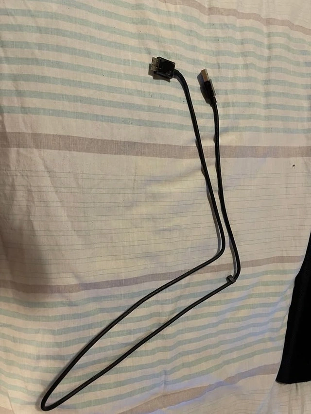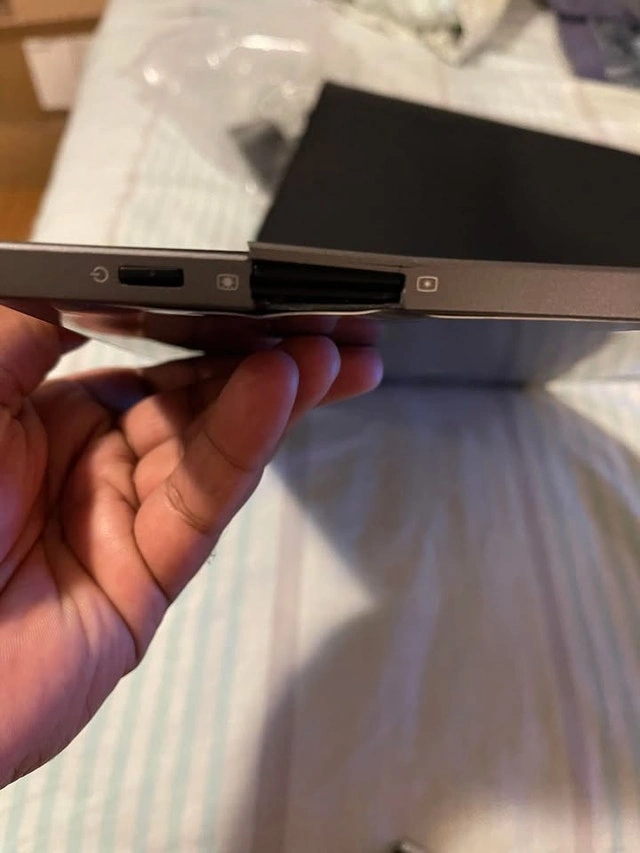 Everything works. The side has a dent that affects the slot and is cosmetic. It still works and comes with a power wire.