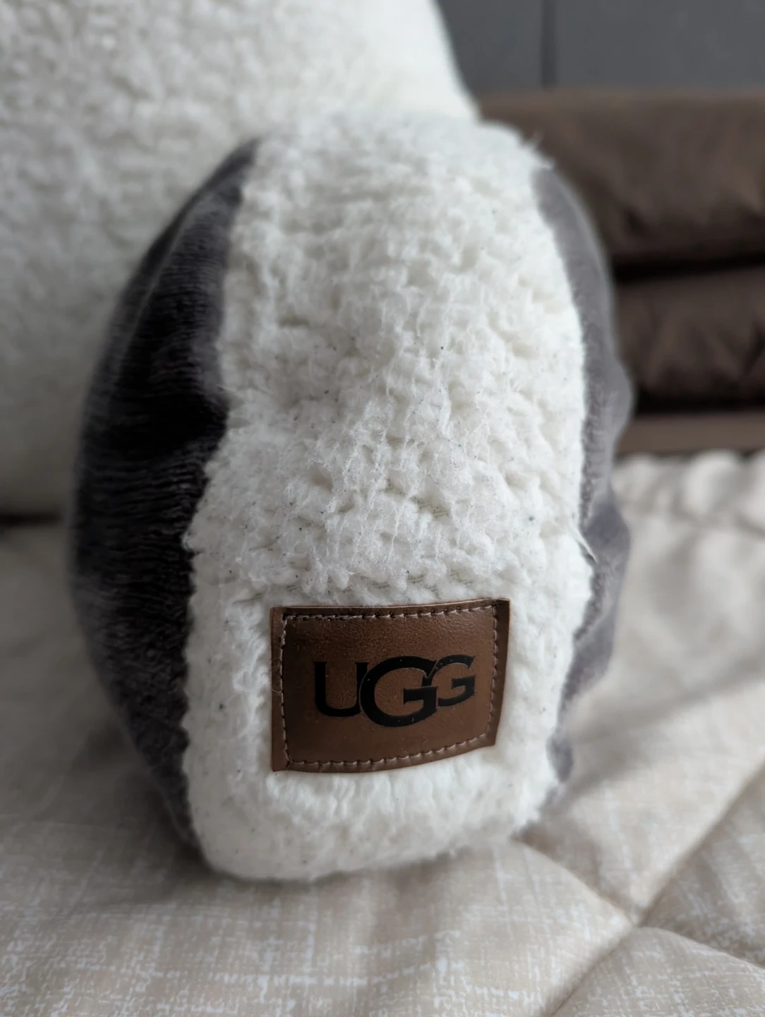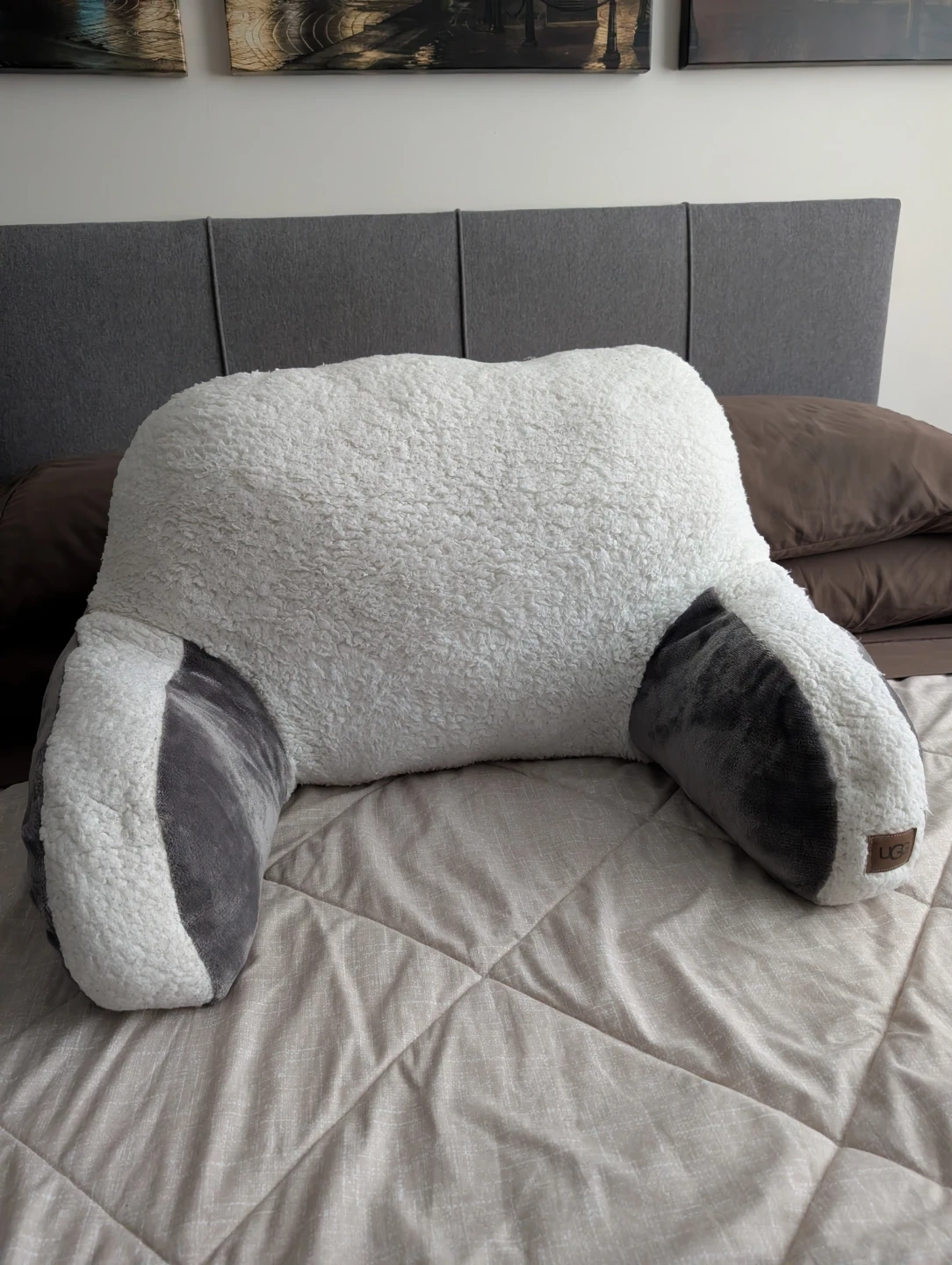 Cozy UGG bedrest/backrest pillow. It's a sherpa and microplush material, perfect for reading in bed or lounging around. The colour is a soft white and grey. Clean, no stains.
