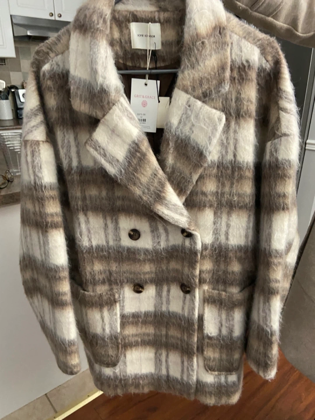 Here's a cozy Sofie Schnoor Grit & Grace jacket in a lovely plaid pattern! It's a size 42 and features a double-breasted design. The original price was $375. It's in great condition and ready to keep you warm and stylish!