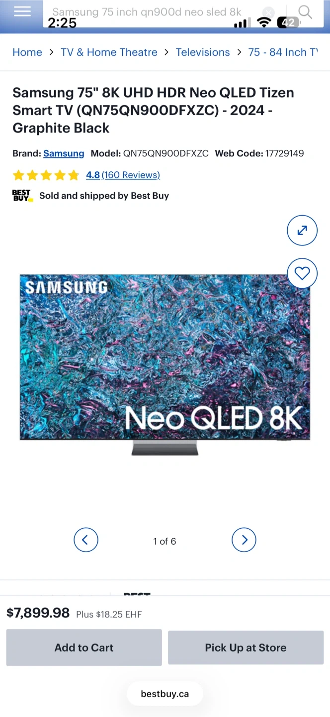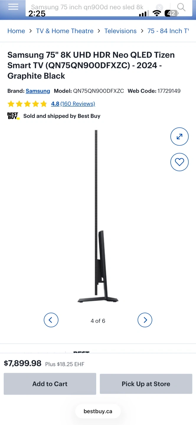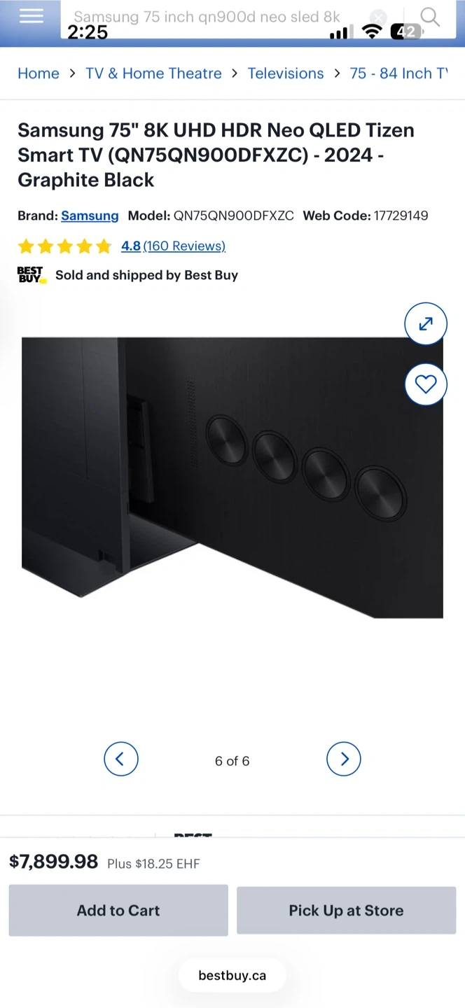 Selling a Samsung 75" 8K UHD HDR Neo QLED Tizen Smart TV (QN75QN900DFXZC) in Graphite Black. Listed for $7,899.98 from Best Buy.