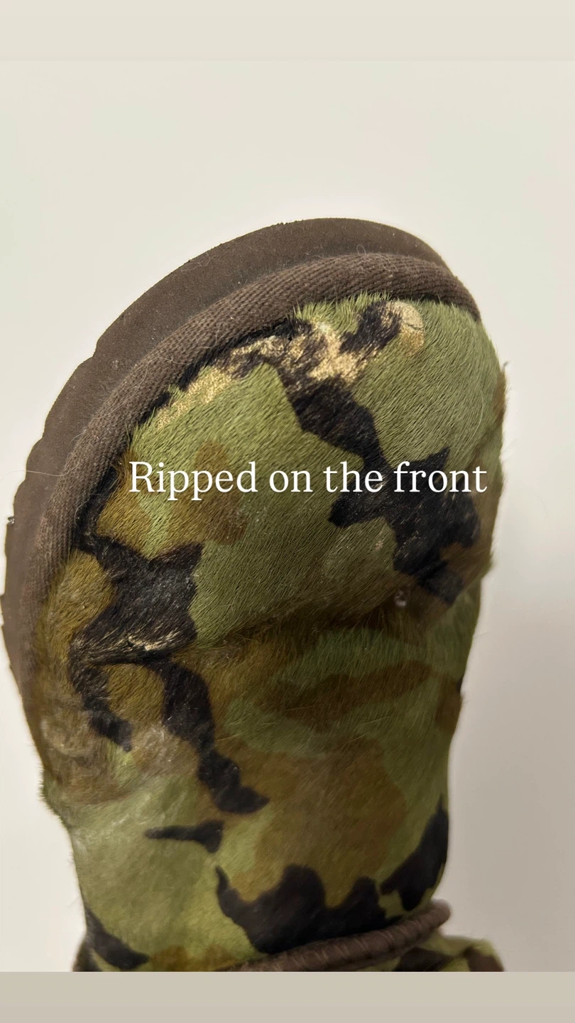 These UGG boots have a camo pattern. There are rips on the front and sides, and the circle backings are hardened and falling off.