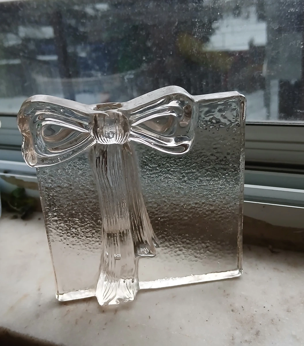Selling a vintage clear glass vase shaped like a gift box with a bow! It's in great condition and would make a lovely addition to any room. Perfect for displaying flowers or as a decorative piece on its own