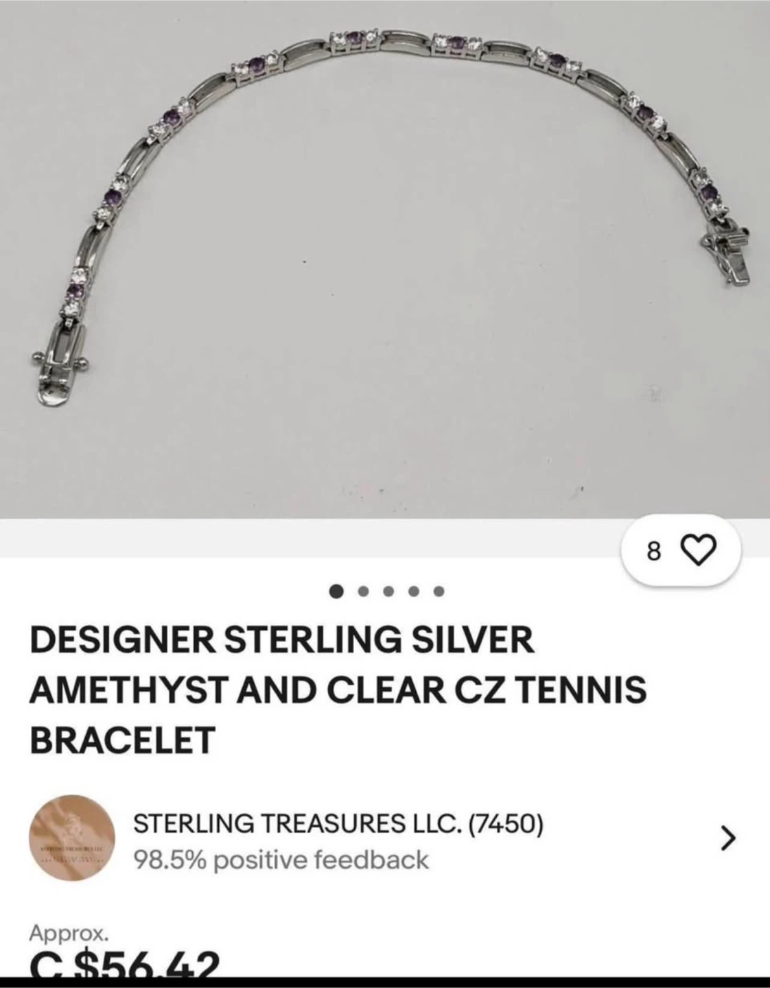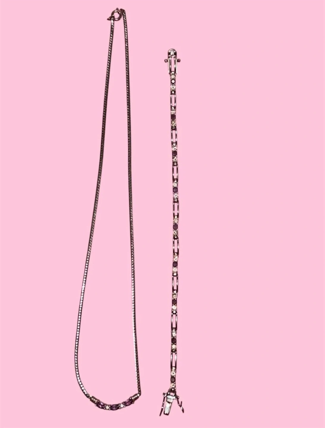 Selling a Kay Jewelers sterling silver tennis necklace with purple amethyst and clear topaz stones, along with a matching amethyst and clear CZ tennis bracelet. Both are in great condition and ready to add a touch of elegance to your collection!