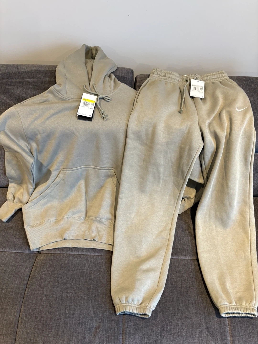 Selling a matching Nike hoodie S size and sweatpants xs size set in a stylish olive green colour. Both pieces feature the iconic Nike swoosh logo. New with tags. Perfect for a comfy and casual look!
