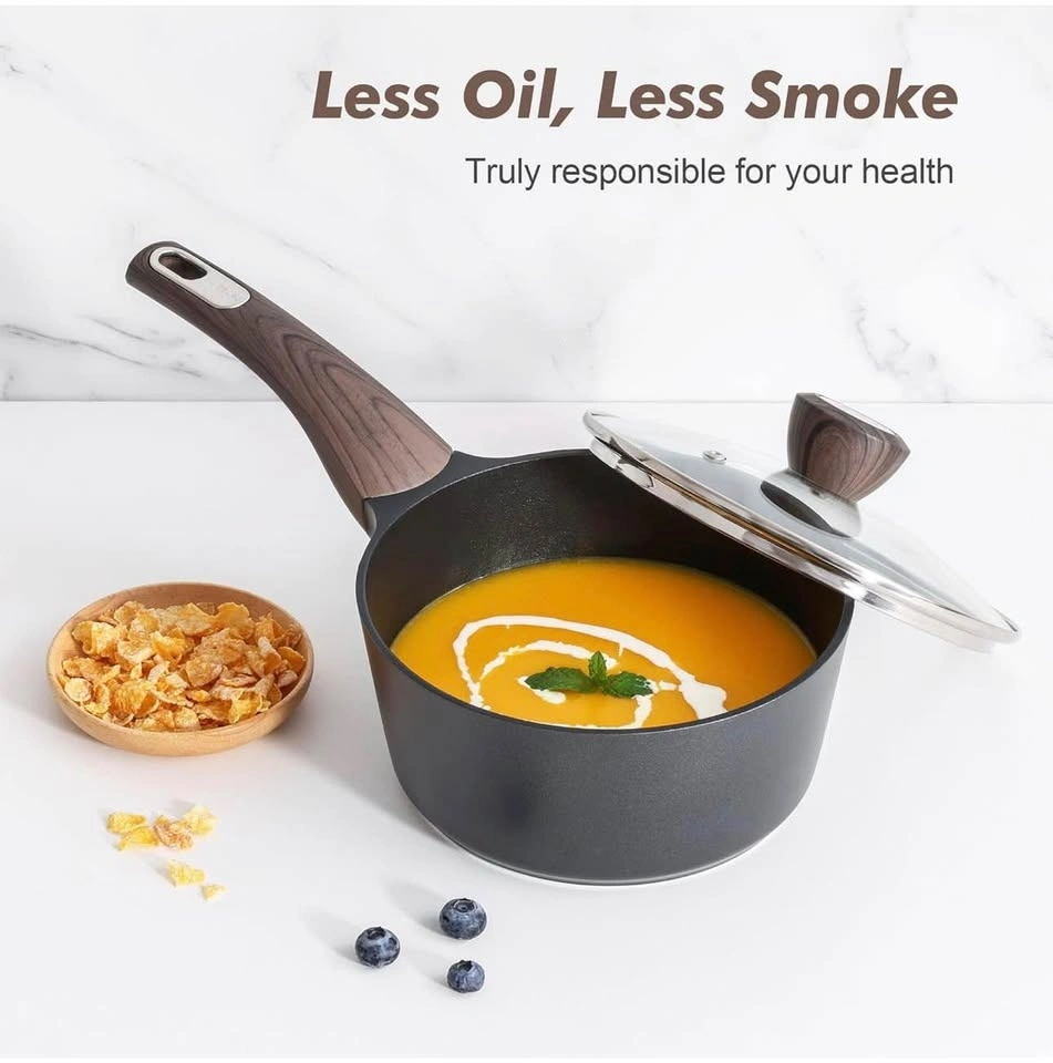 Healthy cookware set with a Switzerland ILAG nonstick surface, safe and non toxic, free of PFOA, PFOS, APEO lead, cadmium and other toxic substances. Non-stick effect lasts longer than ceramic surfaces! Scratch-resistant with excellent food release. Only less oil is needed for cooking, for a healthy, low-fat diet.