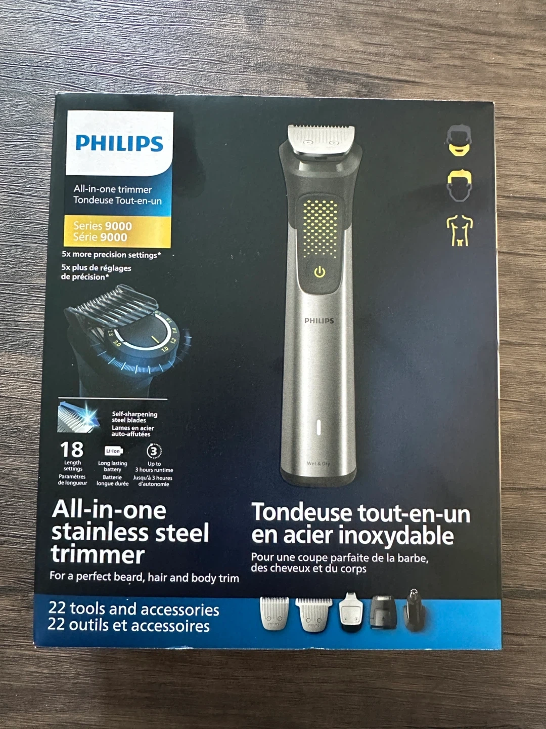 I'm selling a Philips Series 9000 All-in-One stainless steel trimmer! It's perfect for beard, hair, and body trim. It comes with 22 tools and accessories for all your grooming needs. The trimmer features self-sharpening stainless steel blades and provides up to 3 hours of runtime. It's also wet and dry, making it convenient to use in the shower. The box is included!