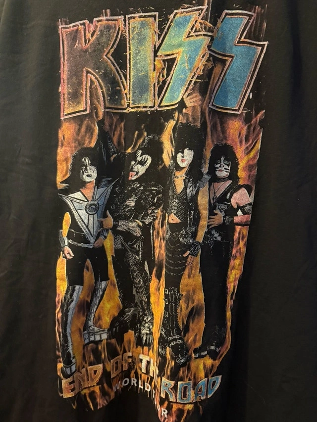Get ready to rock with this used Kiss 'End of the Road' World Tour t-shirt! It's black and features the iconic band members. The shirt is in brand new condition and never worn. Here are some features: