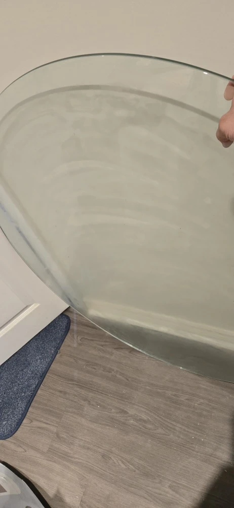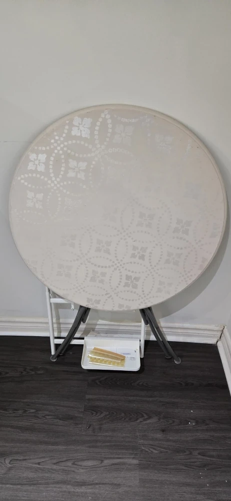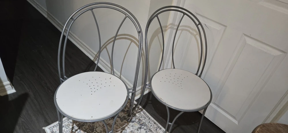 Selling a round table with a glass top and two matching chairs. The chairs have a metal frame and a white seat.