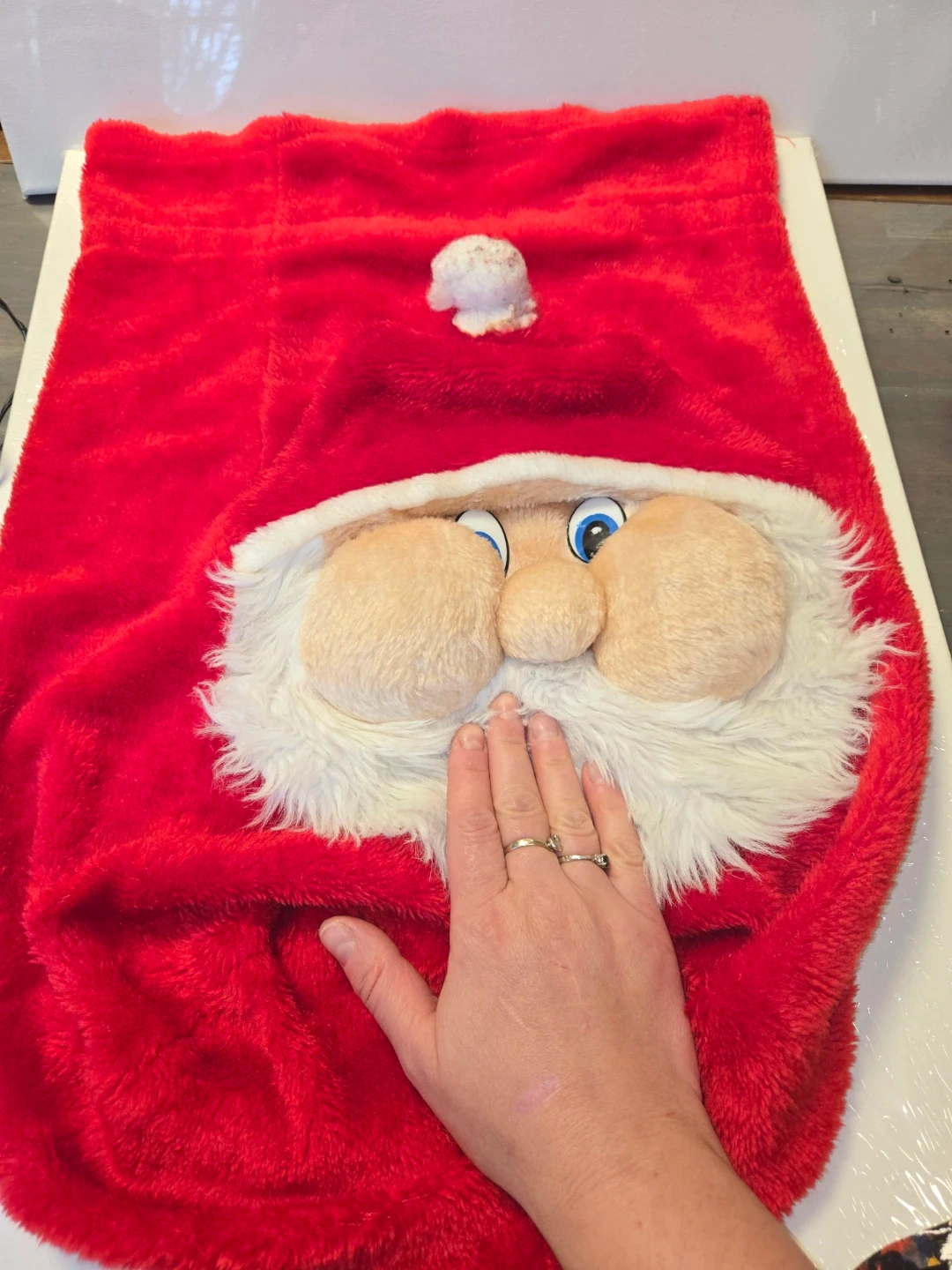 Here's a fun and festive Santa Claus plush bag! It's red and white with a plush Santa face. Perfect for the holidays presents